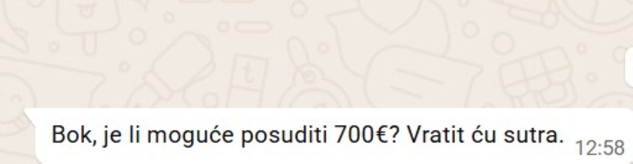 „Poruka je poslana praktički cijelom mom imeniku. Ljudi su me počeli zvati i pitati koliko je hitno, treba li mi doista novac i kamo da ga uplate. U poruci je pisalo: ‘Bok, možeš li mi posuditi 700 eura? Vratit ću sutra.’ Većina je odmah shvatila da nešto ne štima, ali moj otac je zamalo uplatio novac jer nije ni pomislio da bi to mogla biti prevara“, ispričao je za naš portal jedan od oštećenih građana.