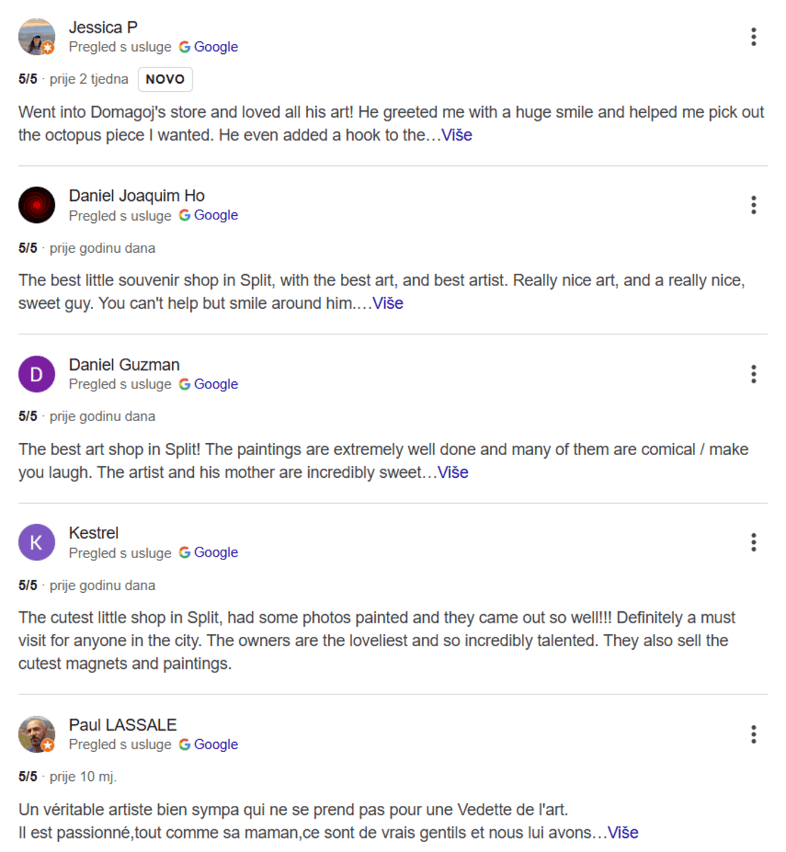 - Najbolja mala suvenirnica u Splitu, s najboljom umjetnošću i najboljim umjetnikom. Stvarno lijepa umjetnost, i stvarno drag, drag tip. Ne možete se ne nasmiješiti u njegovoj blizini. Hvala ti za sve slike koje si nam naslikao!.