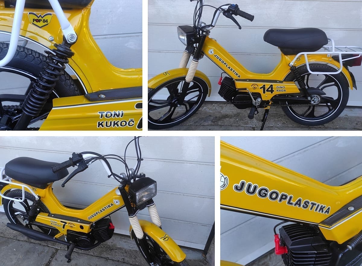 Naime na potpuno obnovljenim Tomosima, obojenima u žutu boju, nalijepljene su naljepnice "Jugoplastika", "Dino Rađa" i "Toni Kukoč".