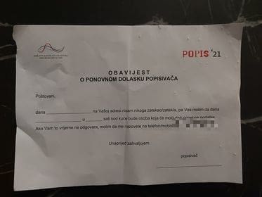 Osam tisuća popisivača radi punom parom diljem Hrvatske, dolaze na kućne adrese i popisuju osobe, kućanstva i stanove. Od onih koji su se samopopisali preuzimaju kontrolnu šifru kao dokaz uspješnog samopopisivanja. Što učiniti ako niste doma: Kako ćete znati da je popisivač već bio na vašim vratima i što napraviti u tom slučaju?