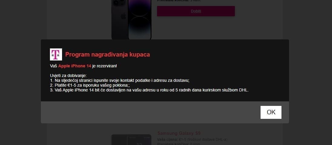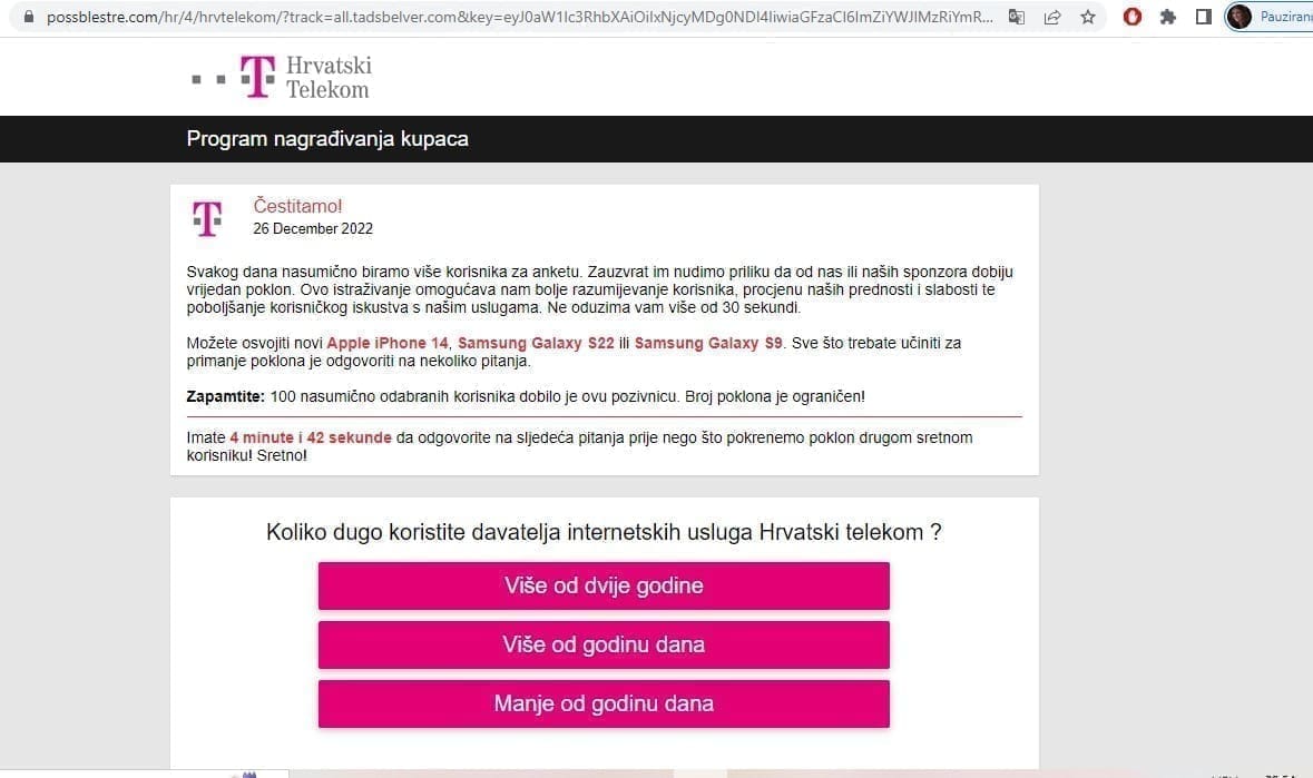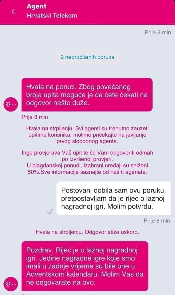 Internetom opet kruži lažna nagradna igra u kojoj se Hrvatski Telekom navodi kao pošiljatelj te koja korisnicima obećava nagrade poput mobilnih uređaja.