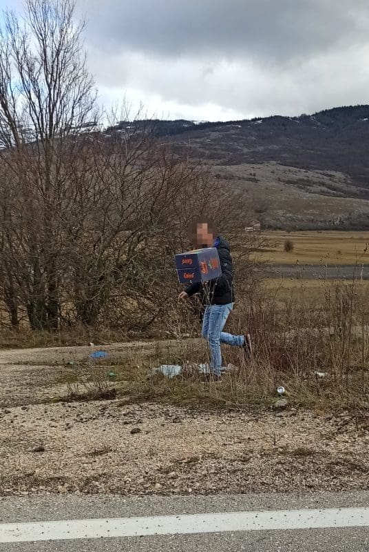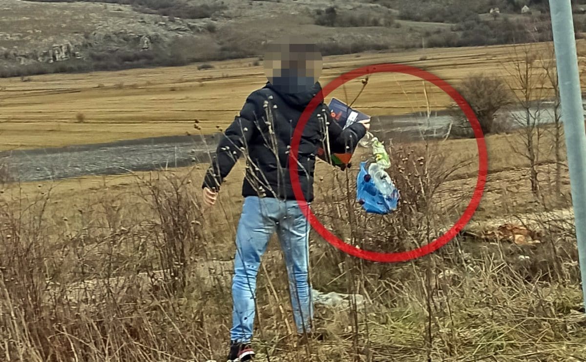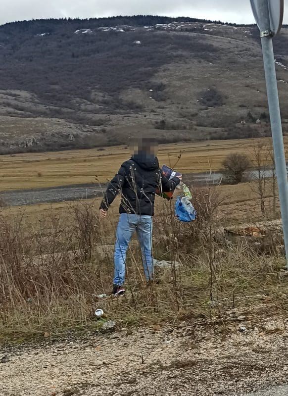 Čovjek vadi 2 pune vreće smeća iz gepeka i baca ih u grmlje. Na trenutak sam pomislio da sam pogrešno vidio iz daleka, ali kada sam prišao, vidim da isto radi i s kutijom punom boca. Zaustavim se i vratim.