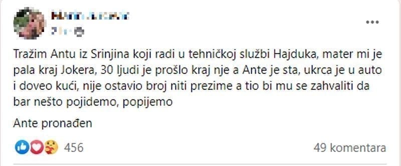 "Tražim Antu iz Srinjina koji radi u tehničkoj službi Hajduka. Mater mi je pala kraj Jokera, 30 ljudi je prošlo kraj nje a Ante je sta, ukrca je u auto i doveo kući. Nije ostavio broj, niti prezime, a 'tio bi mu se zahvaliti da bar nešto pojidemo, popijemo", napisao je muškarac.