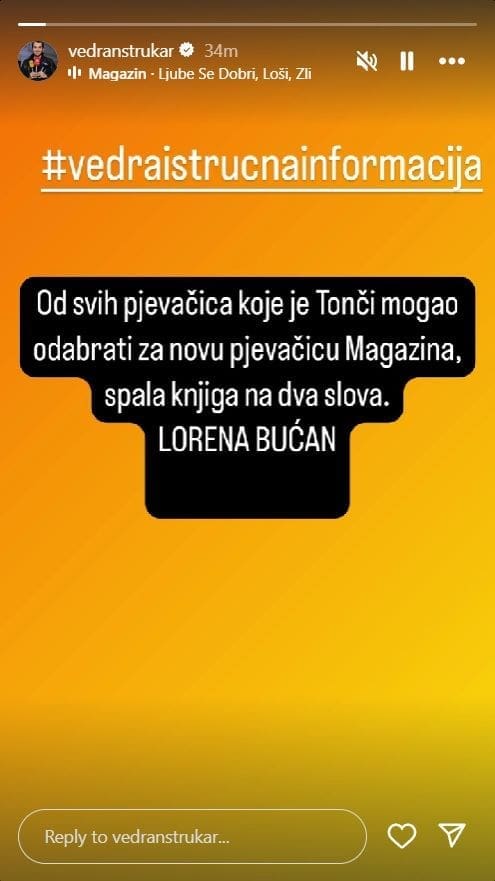 'Svi zovu za istu stvar, prema tome svi ćete imati isti odgovor. Kako se stvari budu odvijale, tako ćete znati. Odavno su to već obećane stvari koje će se znati kada za to dođe vrijeme', poručio je Tonči, koji nas je ljubazno pozdravio i završio razgovor kad smo ga pitali je li Lorena nova pjevačica.