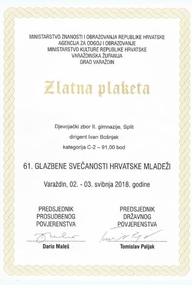 Djevojački zbor splitske II. gimnazije osvojio je zlatnu plaketu u kategoriji C-2 na državnom natjecanju školskih zborova u Varaždinu. Povodom sjajnih nastupa i rezultata splitskog zbora razgovarali smo s njihovim voditeljem i dirigentom, profesorom Ivanom Bošnjakom.
