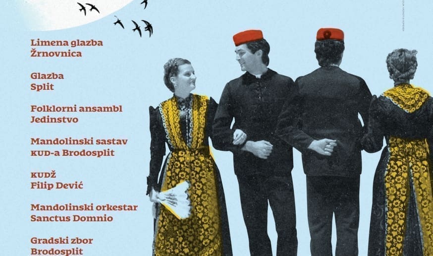 Izvodeći splitske autore, u povorci koja kreće s dna Marmontove ulice u 18.15 prema Tončićevoj ulici, da bi se zatim nastavila ispred Hrvatskog doma s početkom u 18.30 sati, a dijelom u prostoru ovog splitskom glazbenog hrama, publici će se predstaviti sedam ovdašnjih tradicijskih udruga i KUD-ova: Limena glazba Žrnovnica HGD Stjepan Radić, Glazba Split, Folklorni ansambl Jedinstvo, Mandolinski sastav KUD-a Brodosplit, ženska, muška i mješovita klapa KUDŽ-a Filip Dević, Mandolinski orkestar GMD Sanctus Domnio i Gradski zbor Brodosplit.