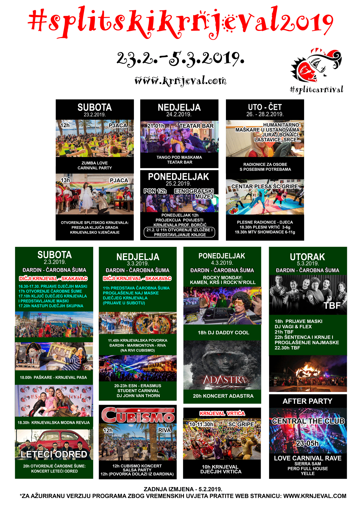 Ove godine predviđeno je čak 15 Krnjevalskih događanja, a samo neka od njih su: plesne radionice za djecu i humanitarne radionice u ustanovama, Dičji krnjeval u Đardinu, krnjevalska modna revija za velike i male, 5. Love carnival rave, koncerti Adastre, Cubisma, TBF-a...