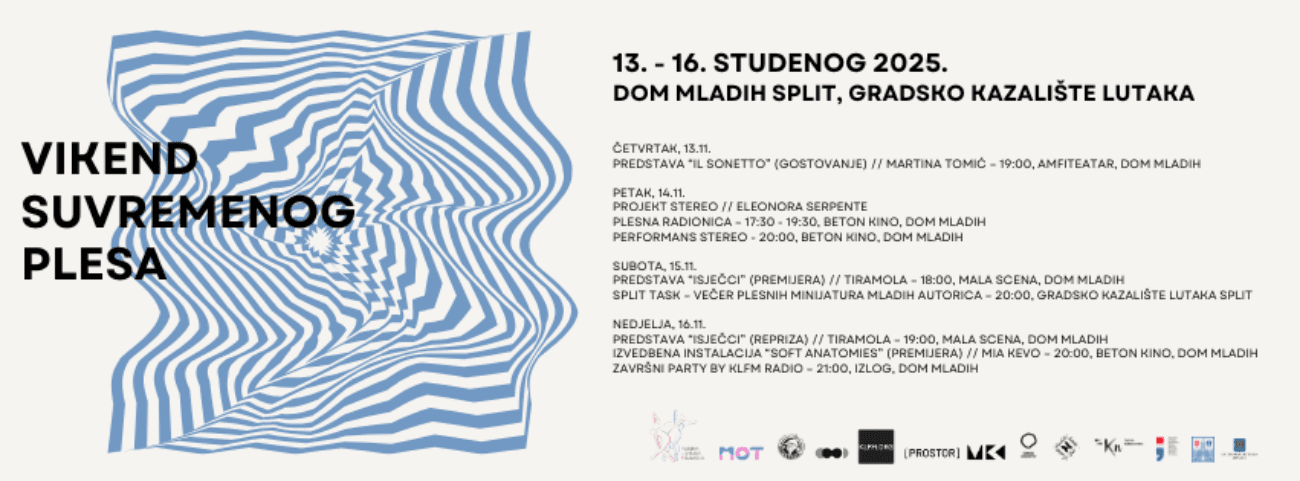 Od 13. do 16. studenog 2025. Split će po prvi put ugostiti Vikend suvremenog plesa, četverodnevni program posvećen suvremenom plesnom stvaralaštvu i eksperimentu, koji okuplja brojne autore i plesne organizacije u zajedničkoj inicijativi za veću vidljivost plesne umjetnosti u gradu.