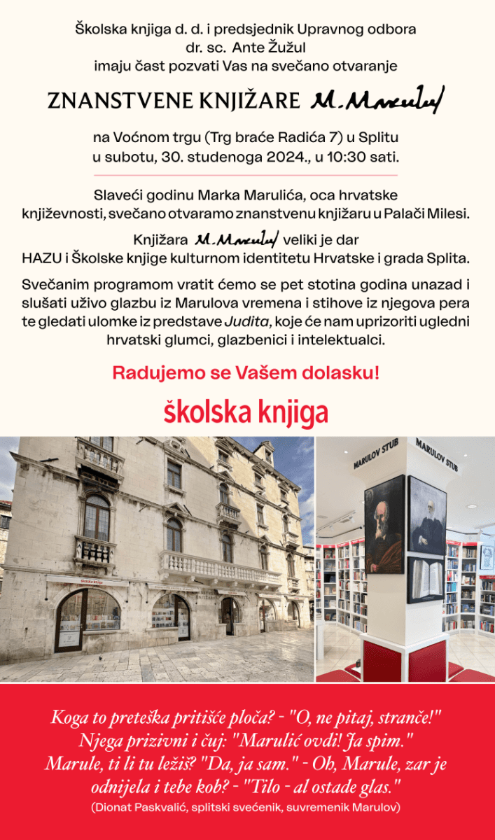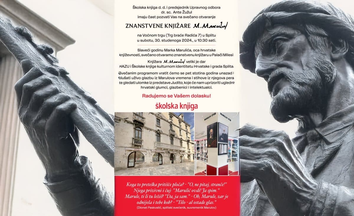 Split se ove subote, 30. studenoga 2024., pridružuje gradovima koji slave kulturnu i povijesnu baštinu Hrvatske. Na Voćnom trgu, u Palači Milesi, otvara se Znanstvena knjižara M. Marul, posvećena Marku Maruliću, ocu hrvatske književnosti. Svečanost počinje u 10:30 sati, a organizator, Školska knjiga d.d., najavljuje bogat program.