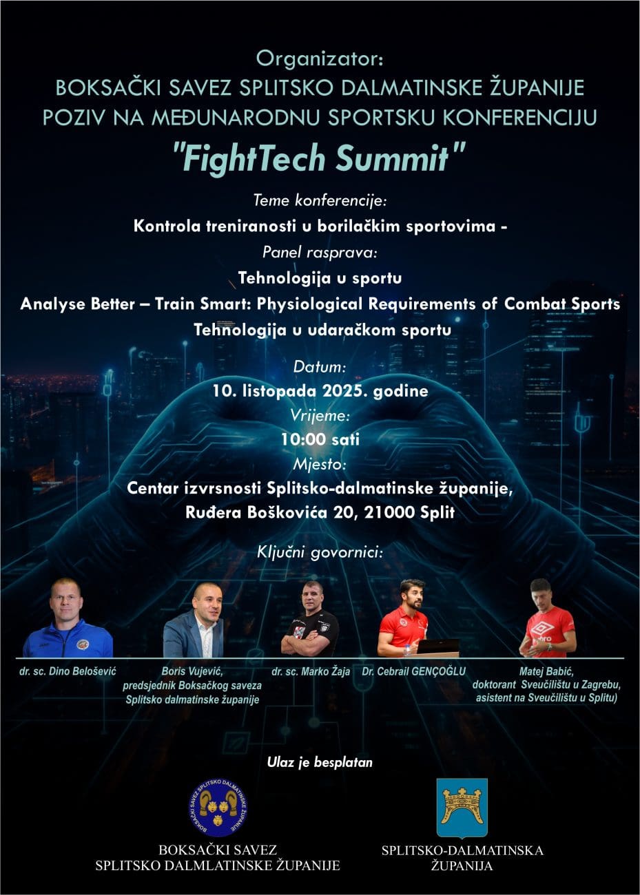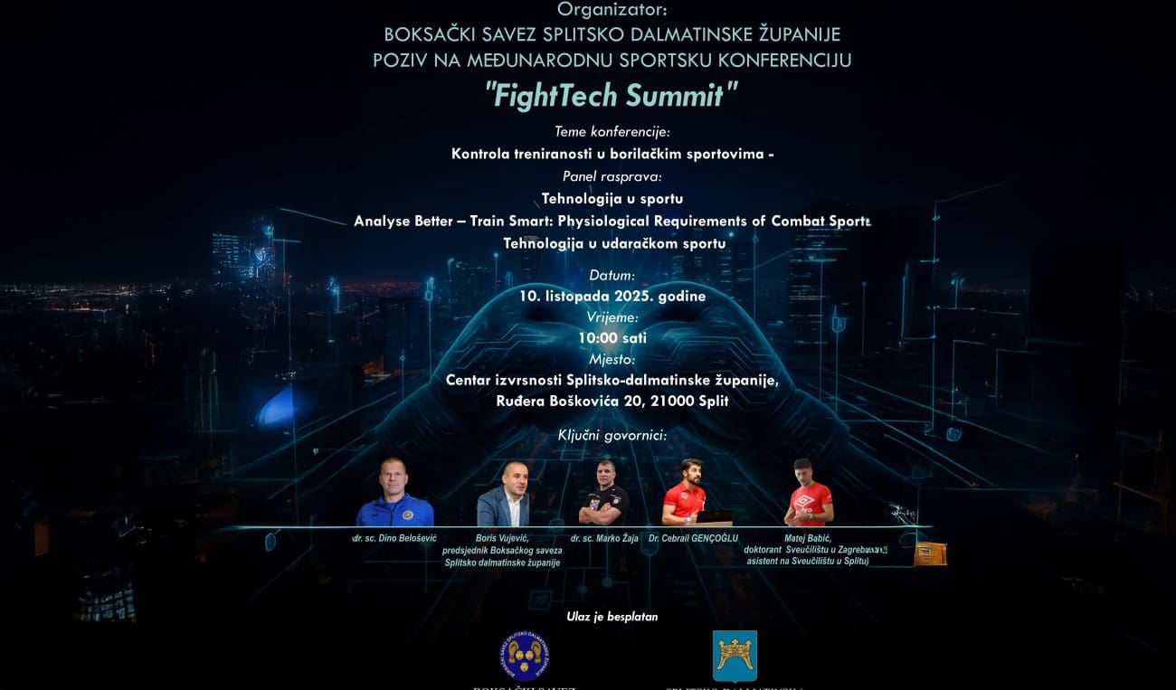 U petak, 10. listopada 2025. godine, u Centru izvrsnosti Splitsko-dalmatinske županije na adresi Ruđera Boškovića 20 u Splitu održat će se međunarodna sportska konferencija "FightTech Summit". Skup počinje u 10 sati, a očekuje se dolazak vodećih domaćih i stranih stručnjaka iz područja sportskih znanosti, tehnologije i borilačkih sportova.