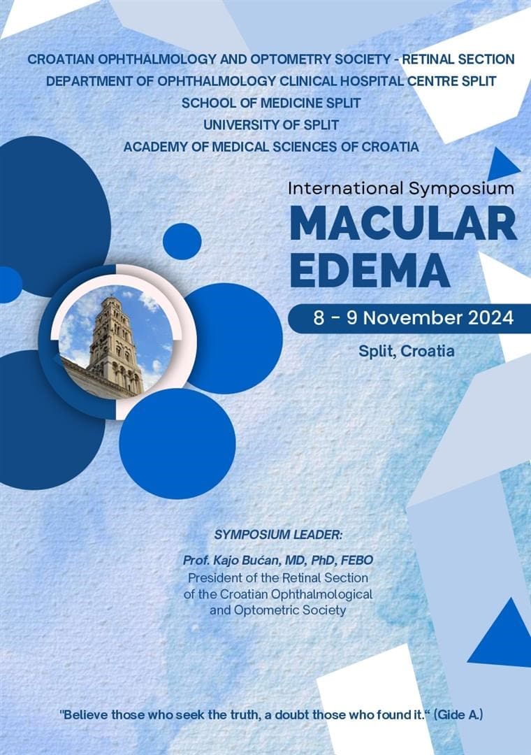 Klinika za očne bolesti Kliničkog centra Split, u suradnji sa Sveučilištem u Splitu, Katedrom za oftalmologiju Medicinskog fakulteta, Sekcijom za retinu Hrvatskog oftalmološkog i optometrijskog društva te Hrvatskom akademijom medicinskih znanosti – podružnica Split, 8. i 9. studenog 2024. organizira međunarodni oftalmološki simpozij „Edem makule“ u hotelu Amphora.