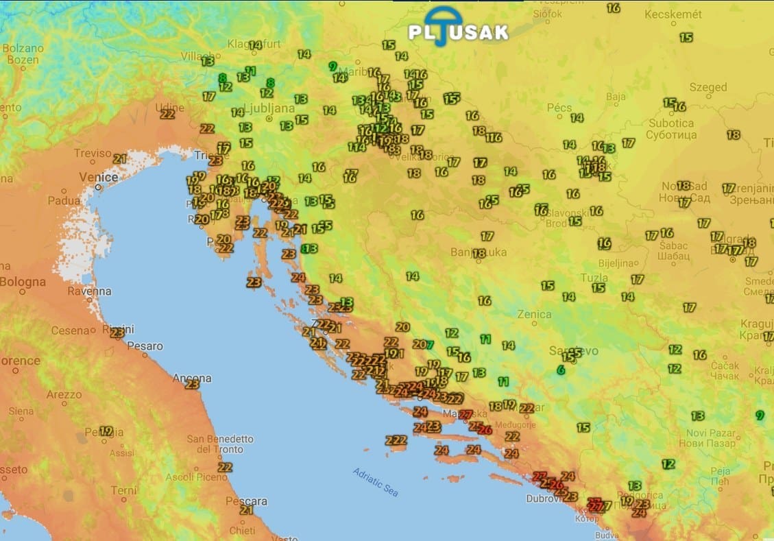 Oko ponoći temperature uz obalu su od 20°C na sjeveru Dalmacije do 25°C na jugu. Podsjetimo, prošle noći ponegdje je bilo 30°C u isto vrijeme. U Zagori su temperature od 17 do 20°C, a najviše je zahladilo u planinama.
