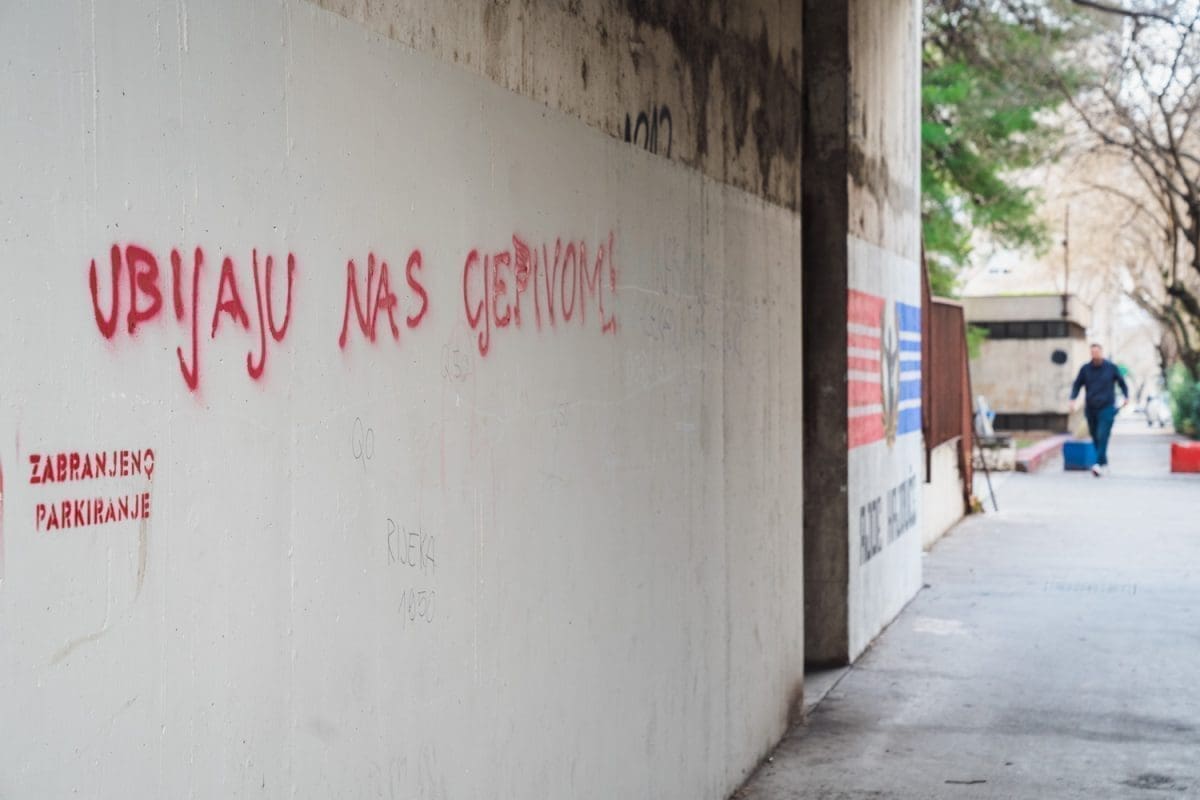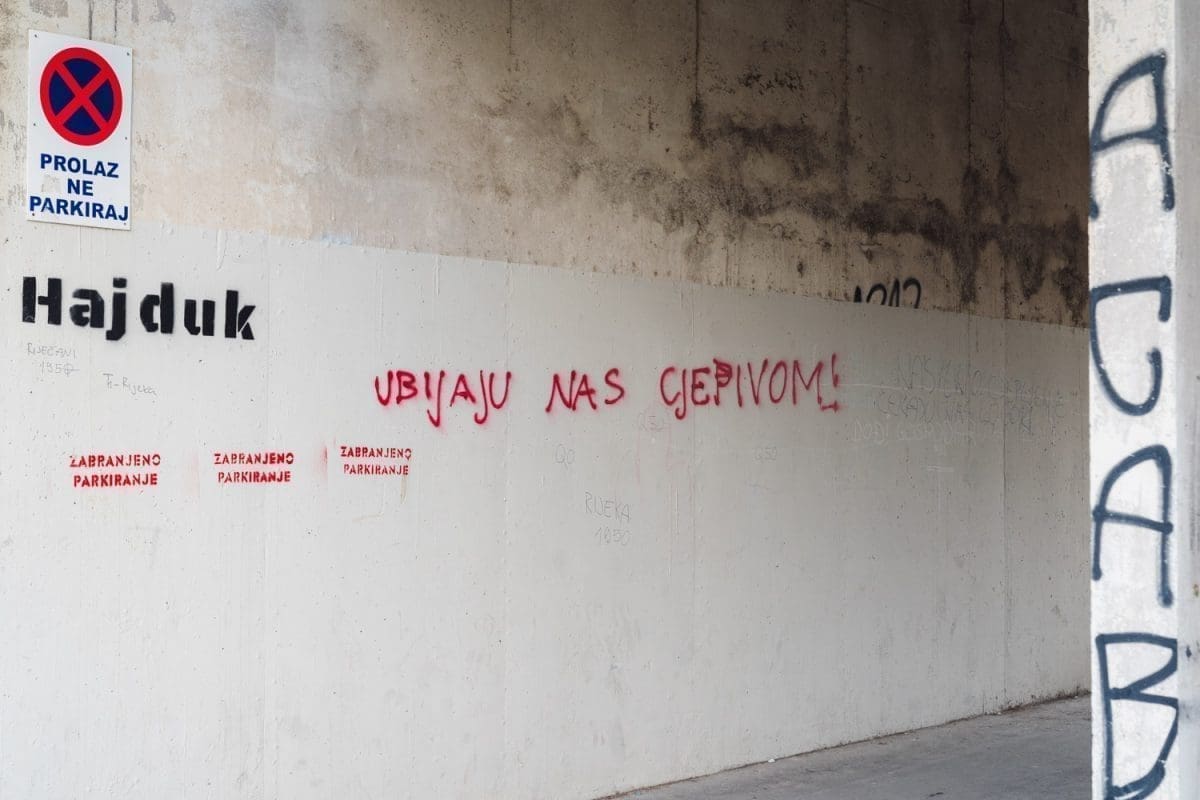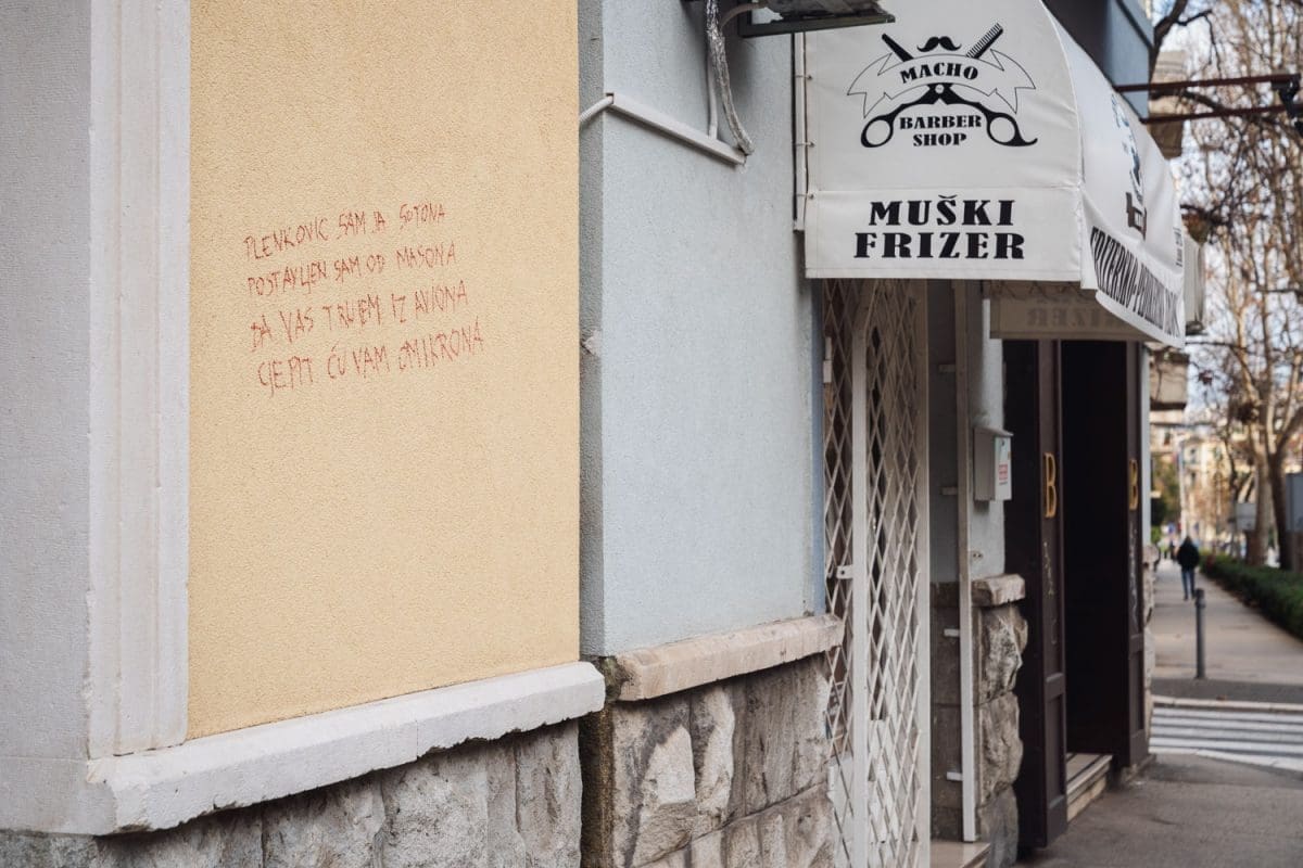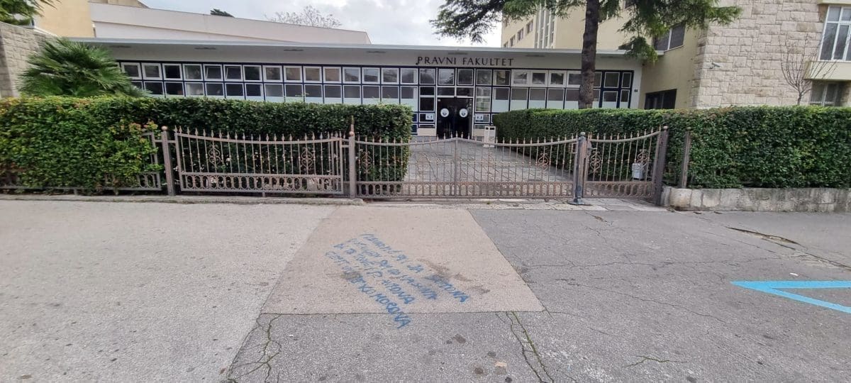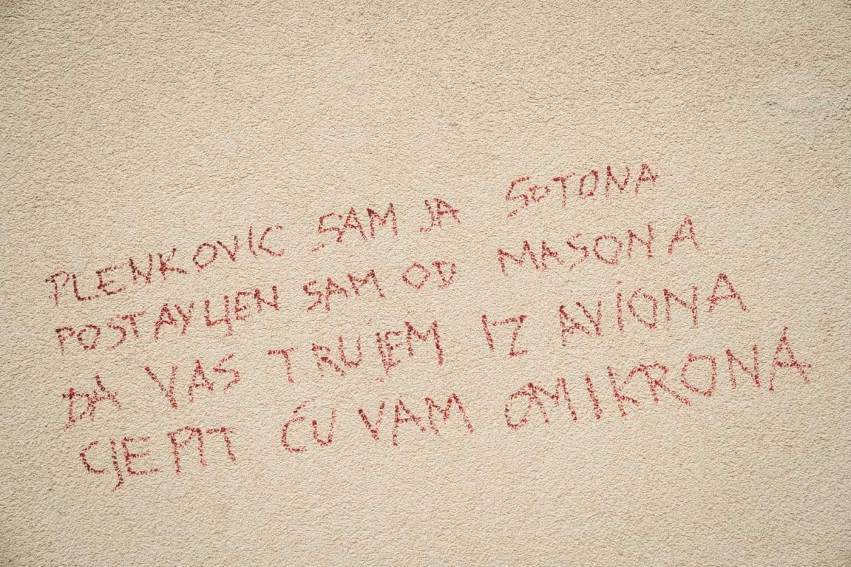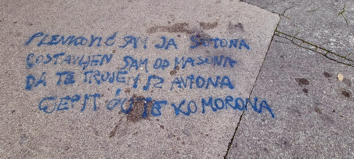 "Plenković sam ja sotona, postavljen sam od masona. Da te trujem iz aviona, cijepit ću te ko morona", natpis je ispisan plavim sprejem koji je osvanuo na nogostupu ispred Pravnog fakulteta u Splitu.
