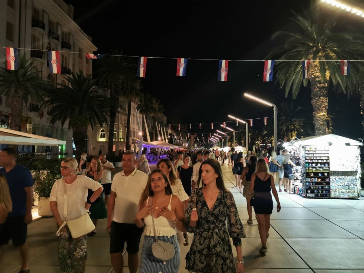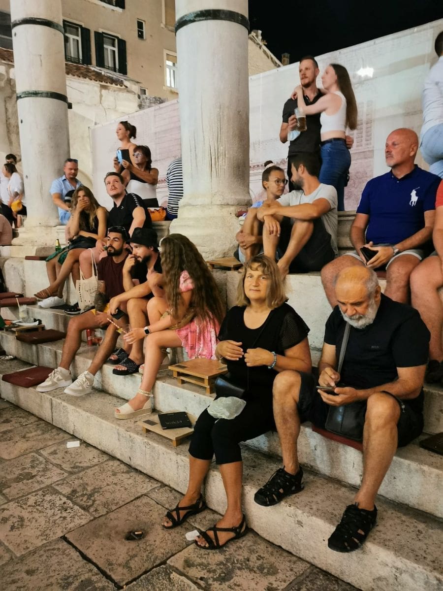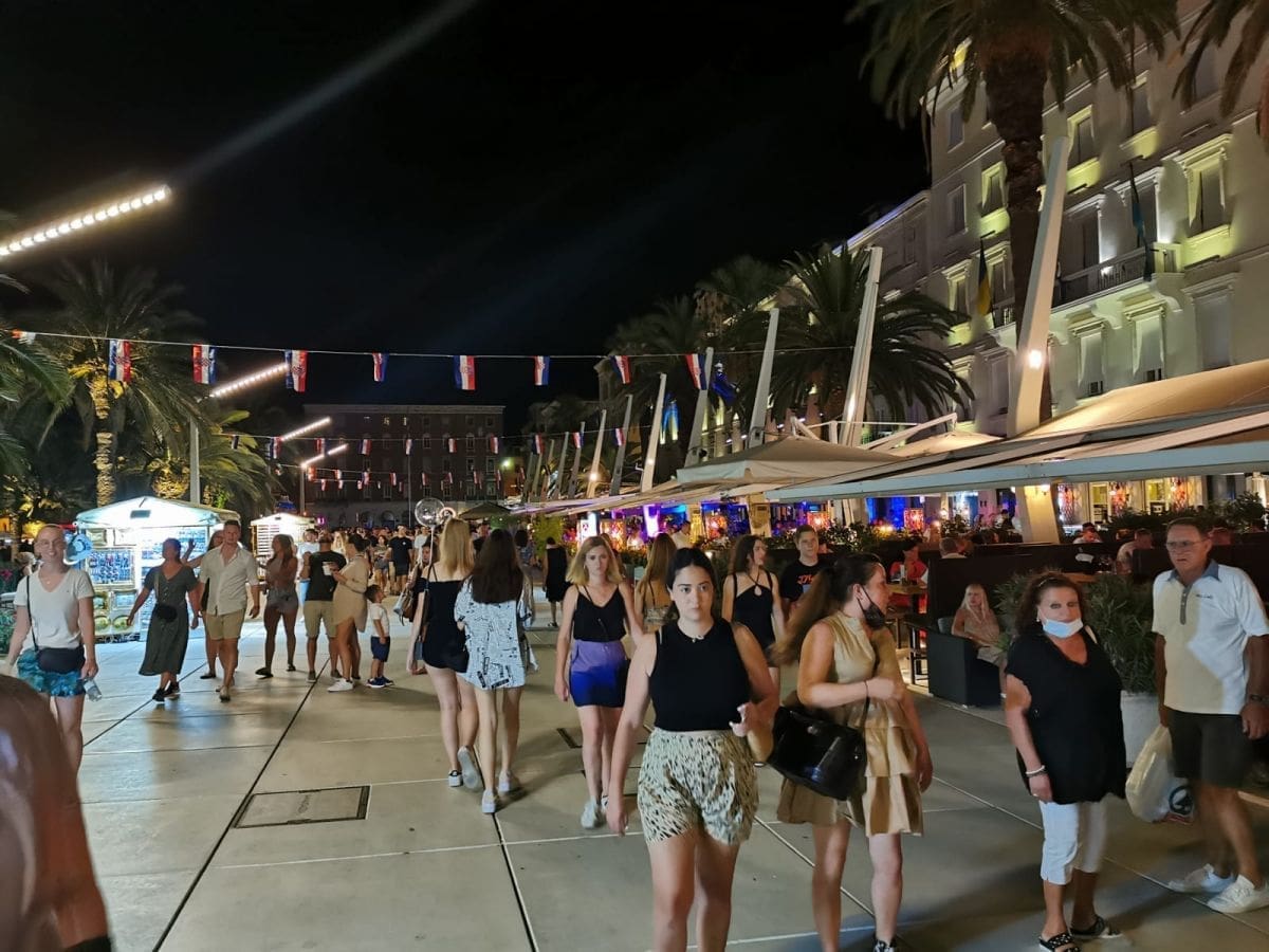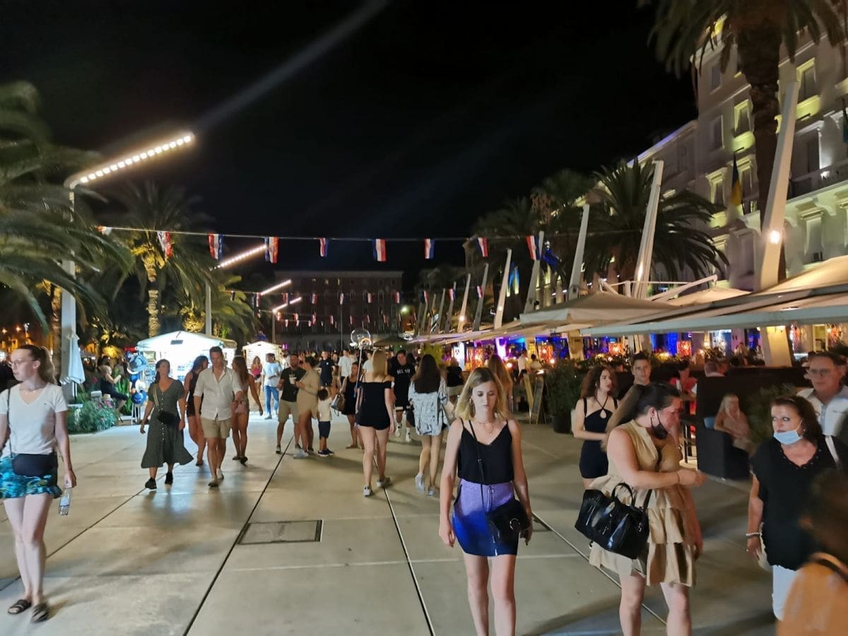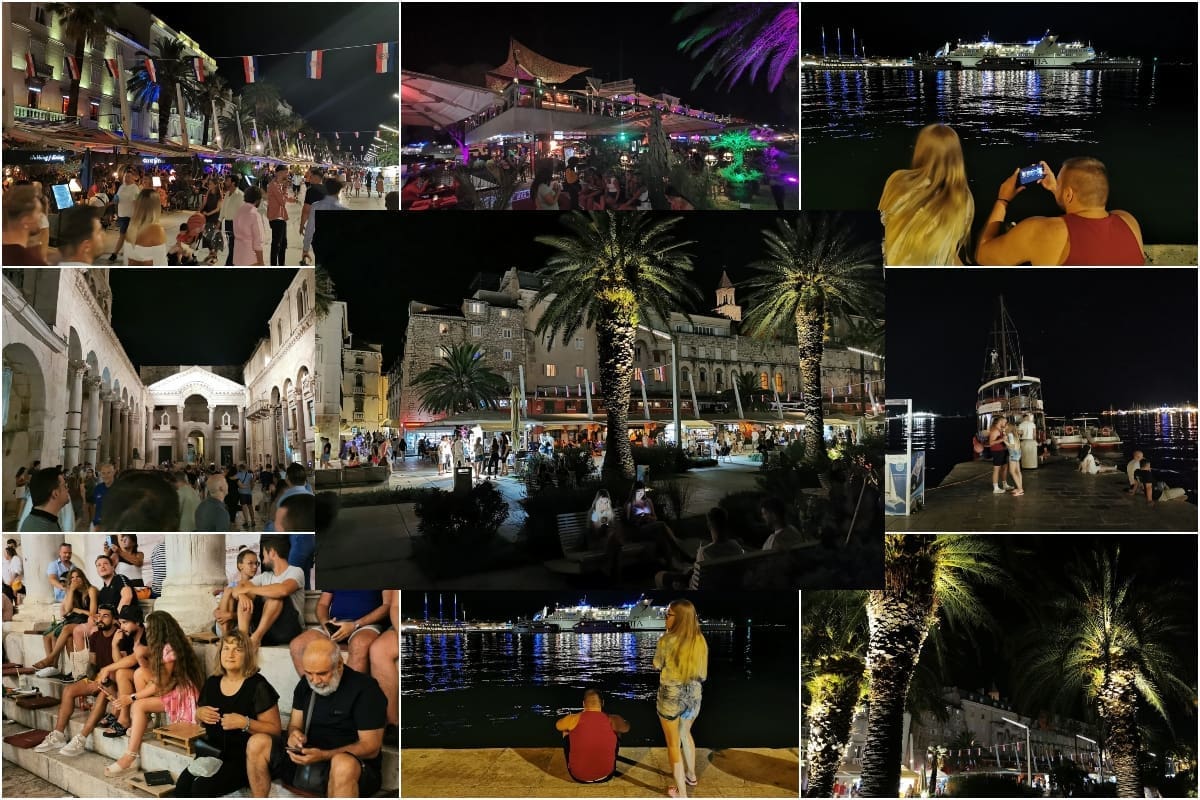 Na Rivi je večeras vladao pravi šušur, ali po uskim gradskim ulicama bilo je mnoštvo ljudi. U kafićima se tražilo mjesto više, a na Peristilu gotovo da nije bilo mjesta za sjesti.