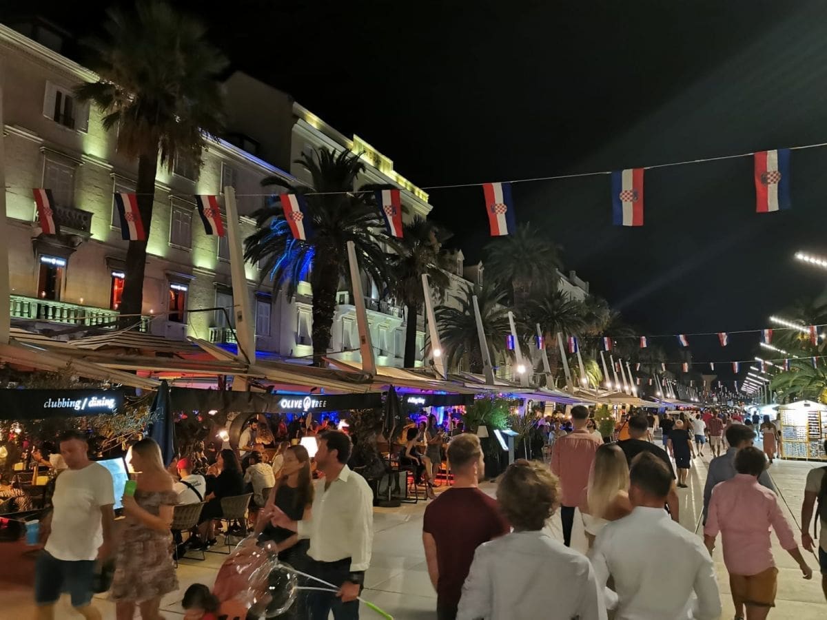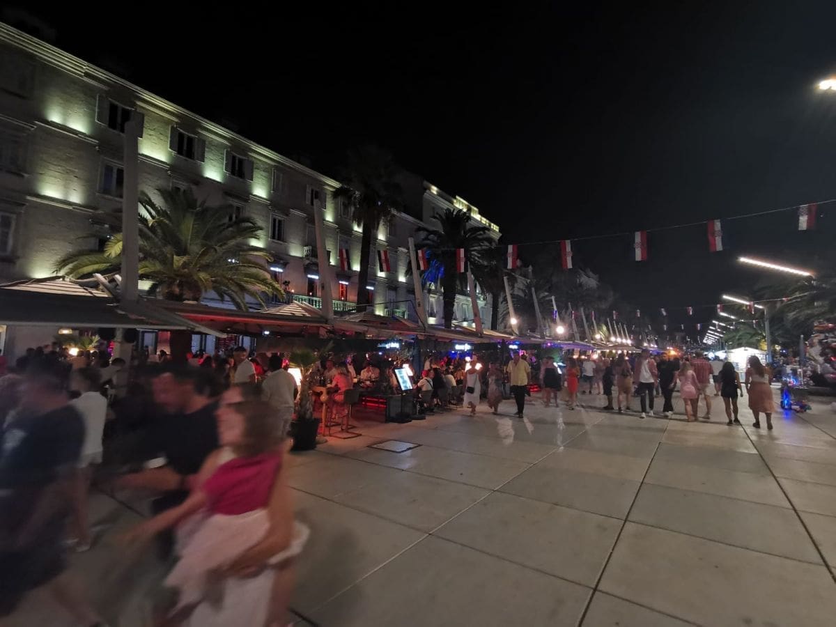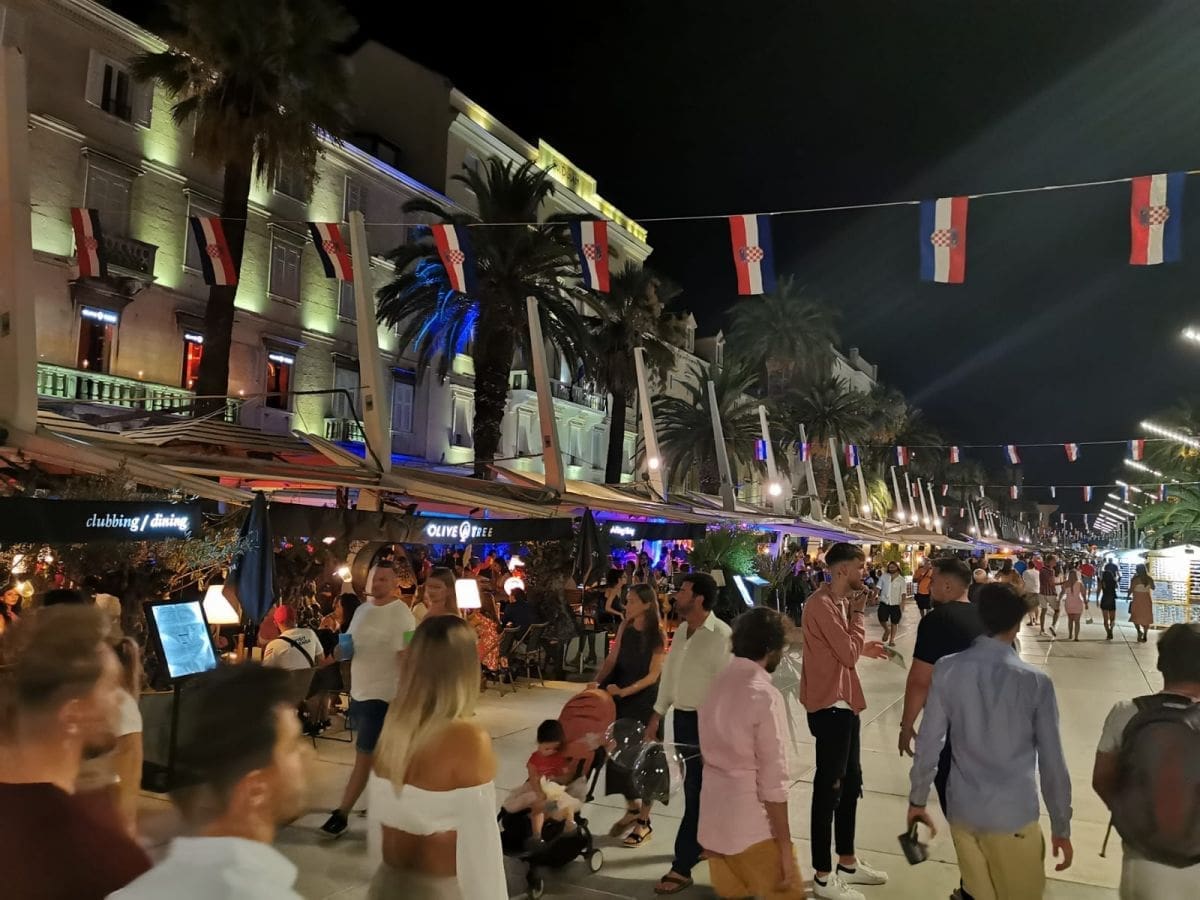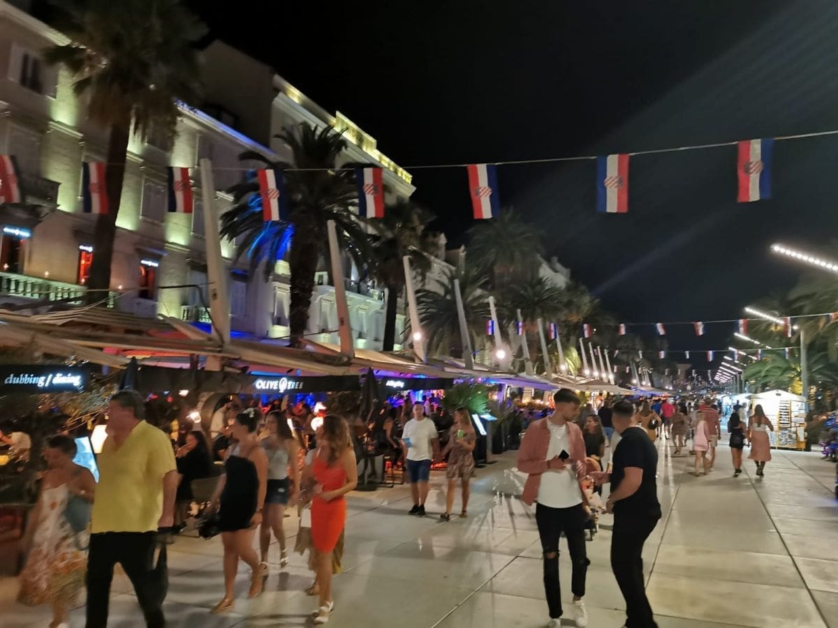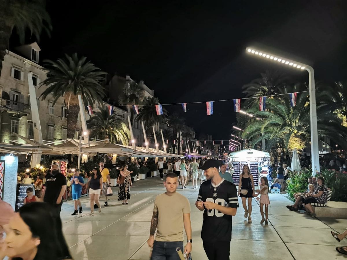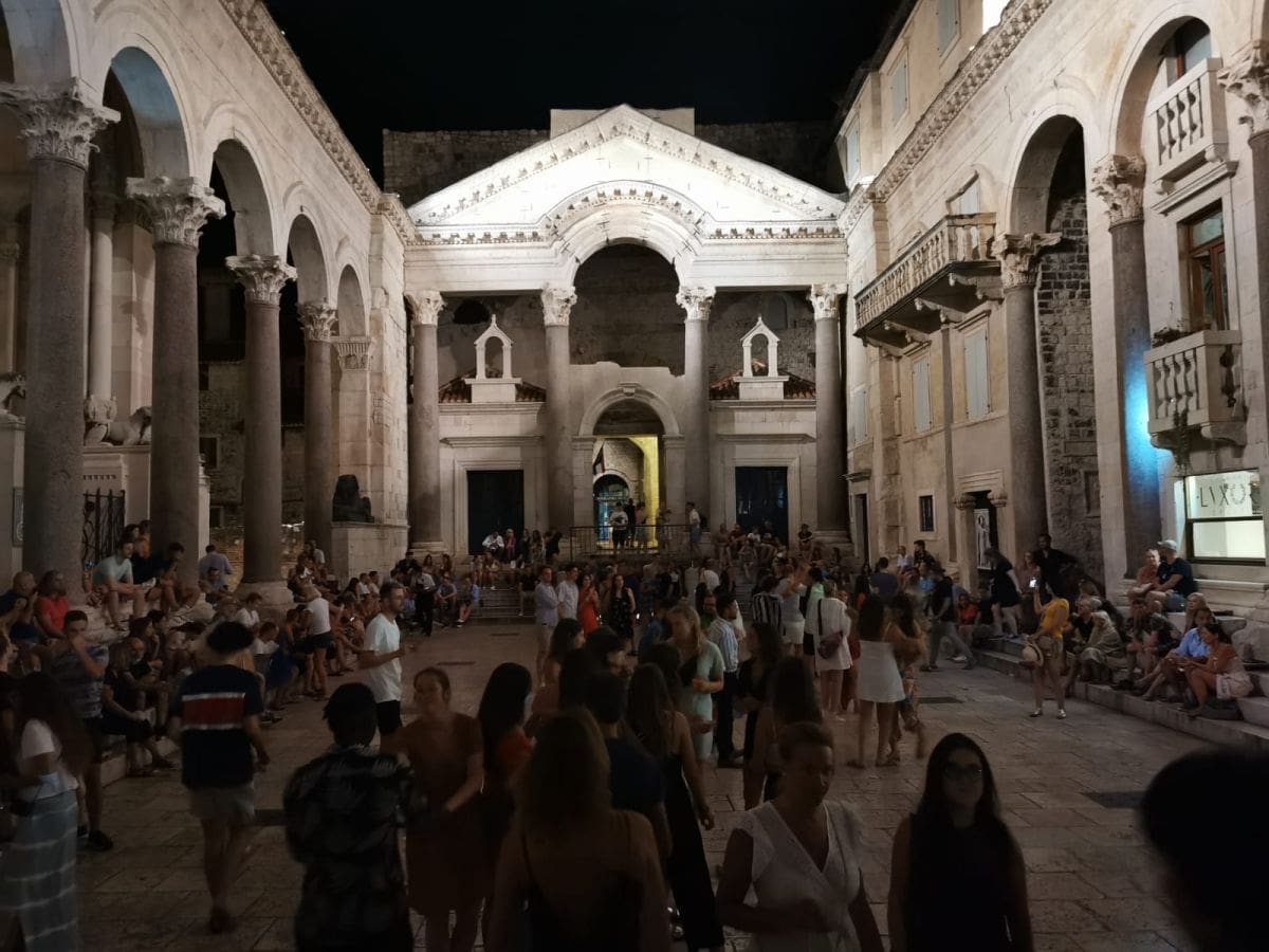 Na Rivi je večeras vladao pravi šušur, ali po uskim gradskim ulicama bilo je mnoštvo ljudi. U kafićima se tražilo mjesto više, a na Peristilu gotovo da nije bilo mjesta za sjesti.