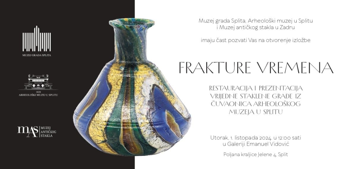 U utorak, 1. listopada 2024. godine u 12 sati u Galeriji Emanuel Vidović u Splitu održat će se svečano otvorenje izložbe Frakture vremena, rezultat suradnje Arheološkog muzeja u Splitu i Muzeja antičkog stakla u Zadru. Naglašavajući suradnju ova dva muzeja, a koja traje od samih početaka, izložba Frakture vremena - Konzervacija i restauracija staklenih predmeta iz fundusa Arheološkog muzeja u Splitu, donosi jedinstvenu zbirku restauriranih staklenih predmeta iz antičkog razdoblja.