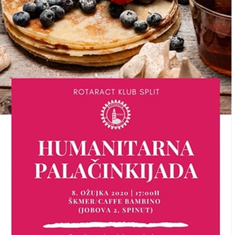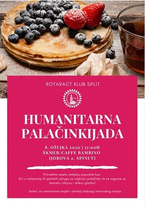 U nedjelju, 8.3.2020. u 17 sati niz splitskih udruga okupiti će se kako bi sudjelovali u prvoj splitskoj humanitarnoj palačinkijadi za potrebite sugrađane. Uz caffe bar „Bambino“ i „Udruženje šefova kuhinja dalmatinskih i europskih regija“ u Jobovoj 2, Spinut imat ćete se priliku dobro zabaviti i uživati uz glazbu, domaće rakije i craft pivo te ukusne palačinke, a usput pomoći u prikupljanju sredstava za nekoliko obitelji izrazito teškog imovinskog stanja.