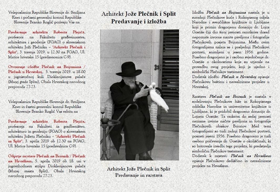 Veleposlanica Republike Slovenije dr. Smiljana Knez i počasni generalni konzul Republike Slovenije Branko Roglić pozivaju sve zainteresirane na predavanje arhitekta Roberta Plejića, profesora na Fakultetu građevinarstva, arhitekture i geodezije (FGAG) o slovenskom arhitektu Joži Plečniku – "Arhitekt Plečnik i Split" koje će se održati 3. travnja 2019. u 12.30 na FGAG, Ul. Matice hrvatske 15 (predavaonica C-9).