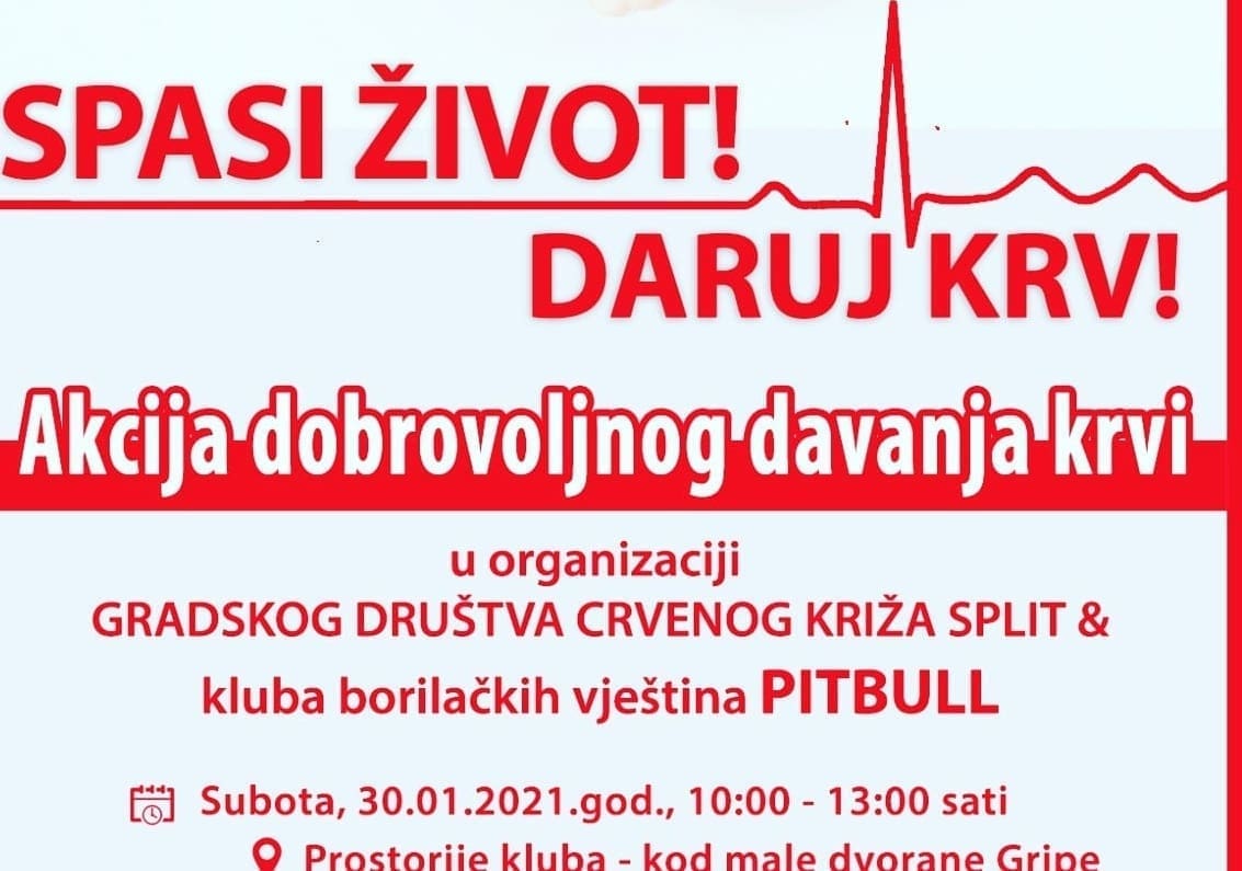 Hrvatski crveni križ Gradsko društvo Split s klubom borilačkih vještina PitBull organizira njihovu prvu akciju darivanja krvi koja će se održati u subotu, 30.1.2021, od 10 do 13 sati, u prostorijama kluba kod male dvorane na Gripama, na adresi Ul. Slobode 16a.