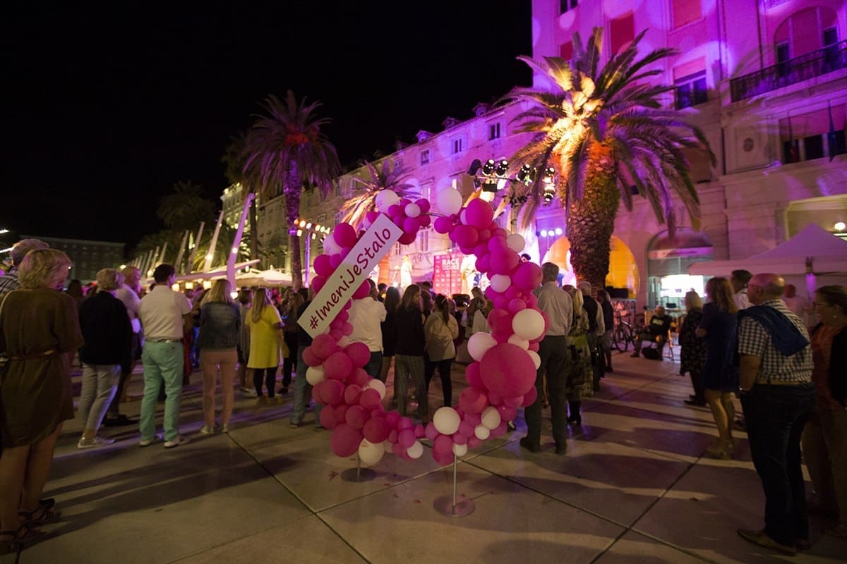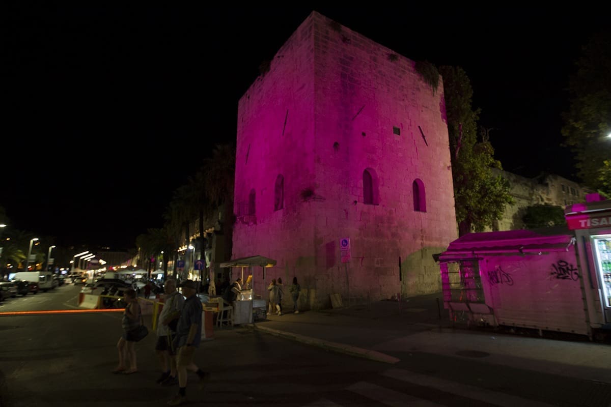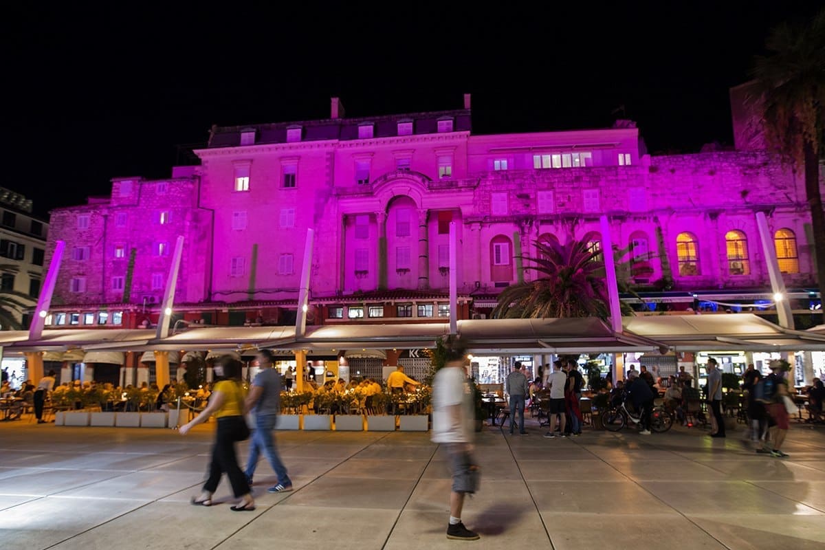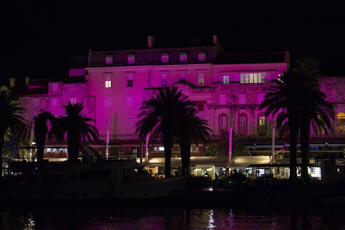 Split je večeras obasjan ružičastom svjetlošću i to: južni dio Dioklecijanove palače, Riva i palme, Peristil, pročelje HNK i zgrada Banovine. Sve u znaku boje humanitarne akcije THINK PINK, koja se po prvi puta ove godine održava i u Hrvatskoj i to baš u Splitu.