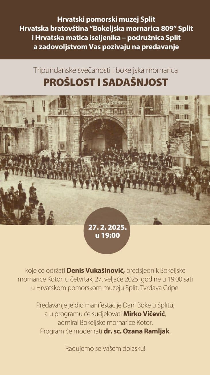 Denis Vukašinović, predsjednik Bokeljske mornarice Kotor, održati će izlaganje o bogatoj prošlosti Bokeljske mornarice kao promotora i ključnog sudionika vanjske proslave svetog Tripuna, naravno u bliskoj suradnji Kotorskom biskupijom. Poseban naglasak je stavljen na značaj dana 13. siječnja 809. godine, kada su moći sveca dospjele u Kotor, koji Bokeljska mornarica smatra datumom svog nastanka, vezujući se neraskidivo uz svetog Tripuna. Upravo je na ovaj datum, prije godinu dana, 13. siječnja 2024. godine, na svečanoj akademiji u Kotoru, potpisan Sporazum o suradnji između Bokeljske mornarice Kotor, njenih podružnica i Hrvatskih bratovština "Bokeljska mornarica 809" iz Pule, Rijeke, Splita i Zagreba.
