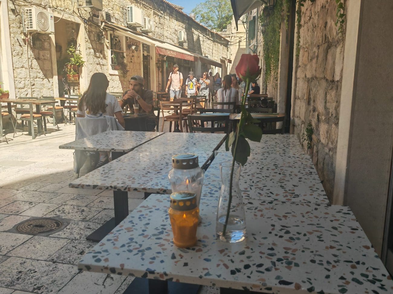 Ispred restorana ostavljene su svijeće i ruža.