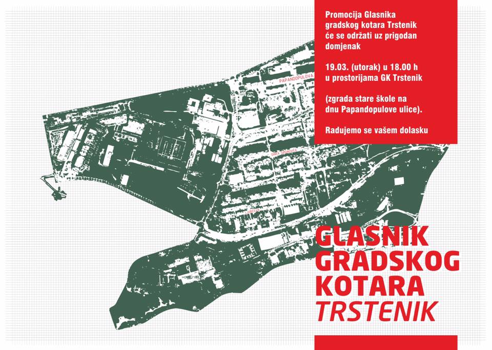 Promocija Glasnika gradskog kotara Trstenik će se, uz prigodni domjenak, sljedeći utorak (19. ožujka) s početkom u 18 sati u prostorijama GK Trstenik (zgrada stare škole na dnu Papandopulove ulice).
