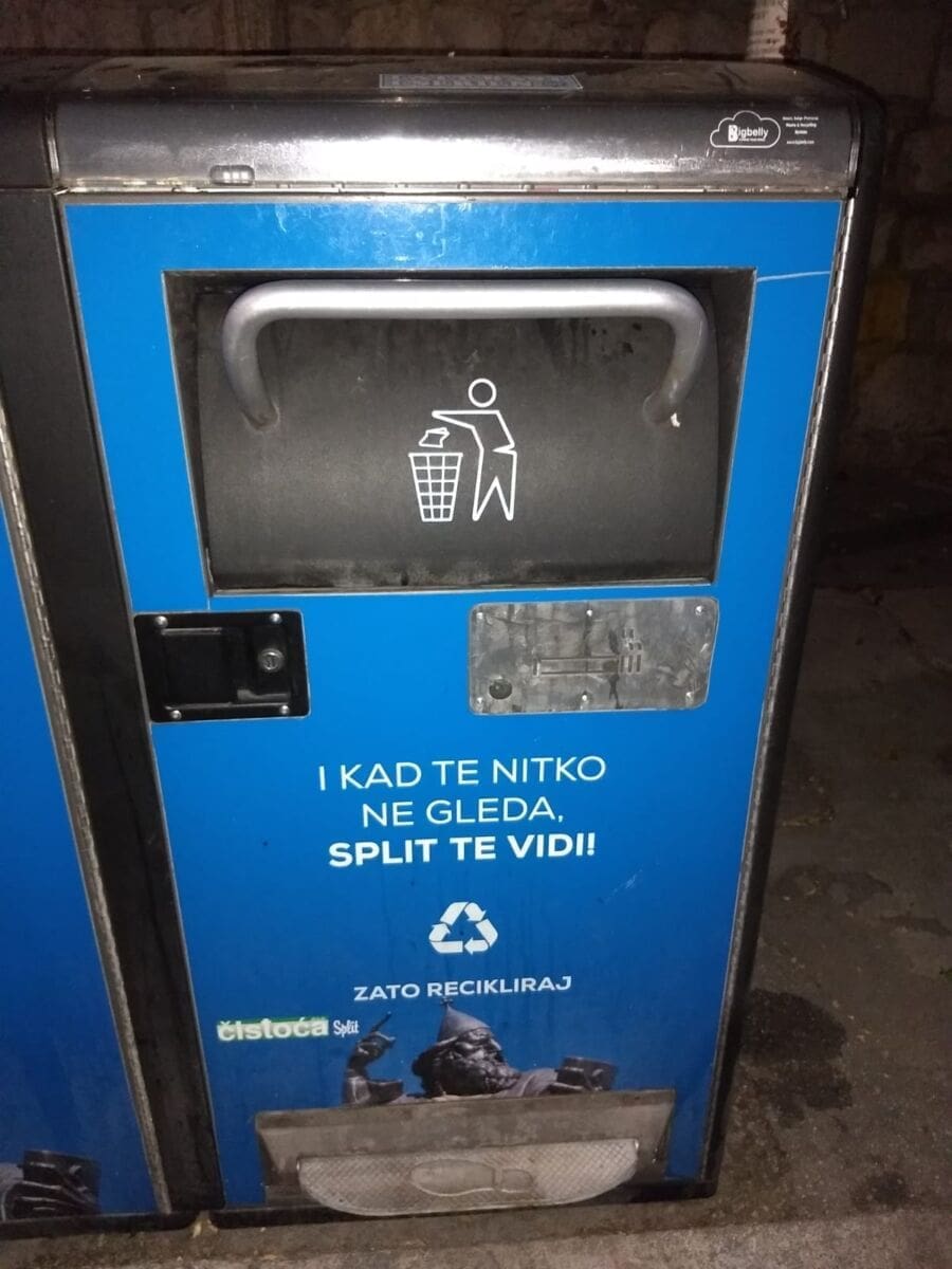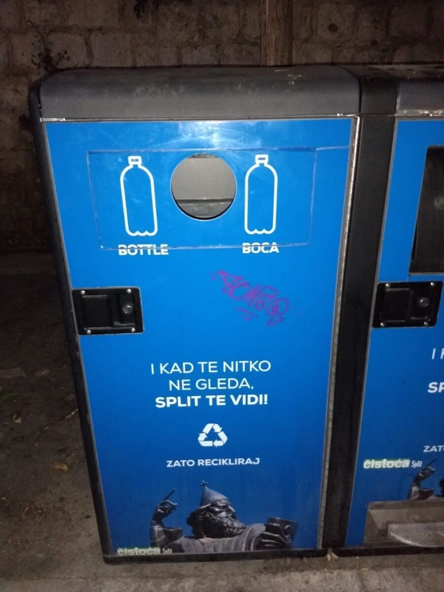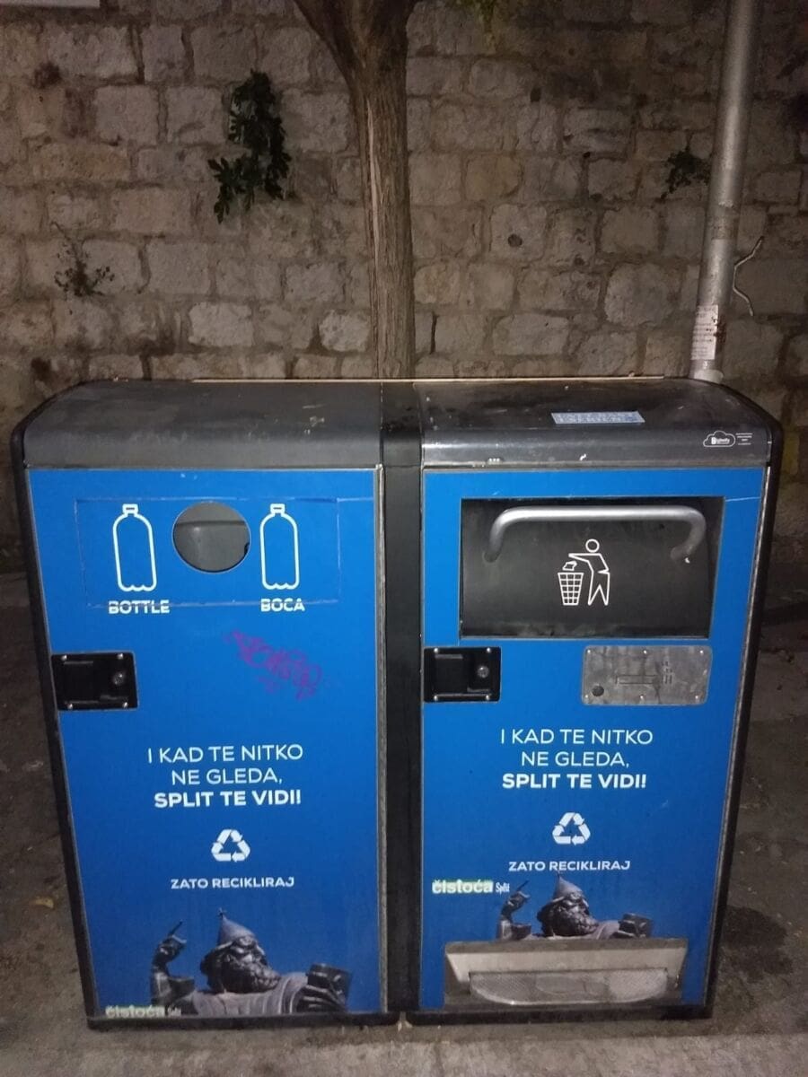 Na kantama koje služe za prikupljanje boca simbolično piše "I kad te nitko ne gleda, Split te vidi, zato recikliraj". Umjesto u kantama za recikliranje boce najčešće završavaju u crnim vrećama sakupljača boca koji na taj način, odnosno otkupom boca pokušavaju sebi omogućiti minimalne uvjete za život. Često, kako bi se domogli boca, kante obiju ili im razbiju vratašca. Takvih kanti u gradu je sve više, a još jedan dokaz tome su i fotografije koje nam je poslao čitatelj.