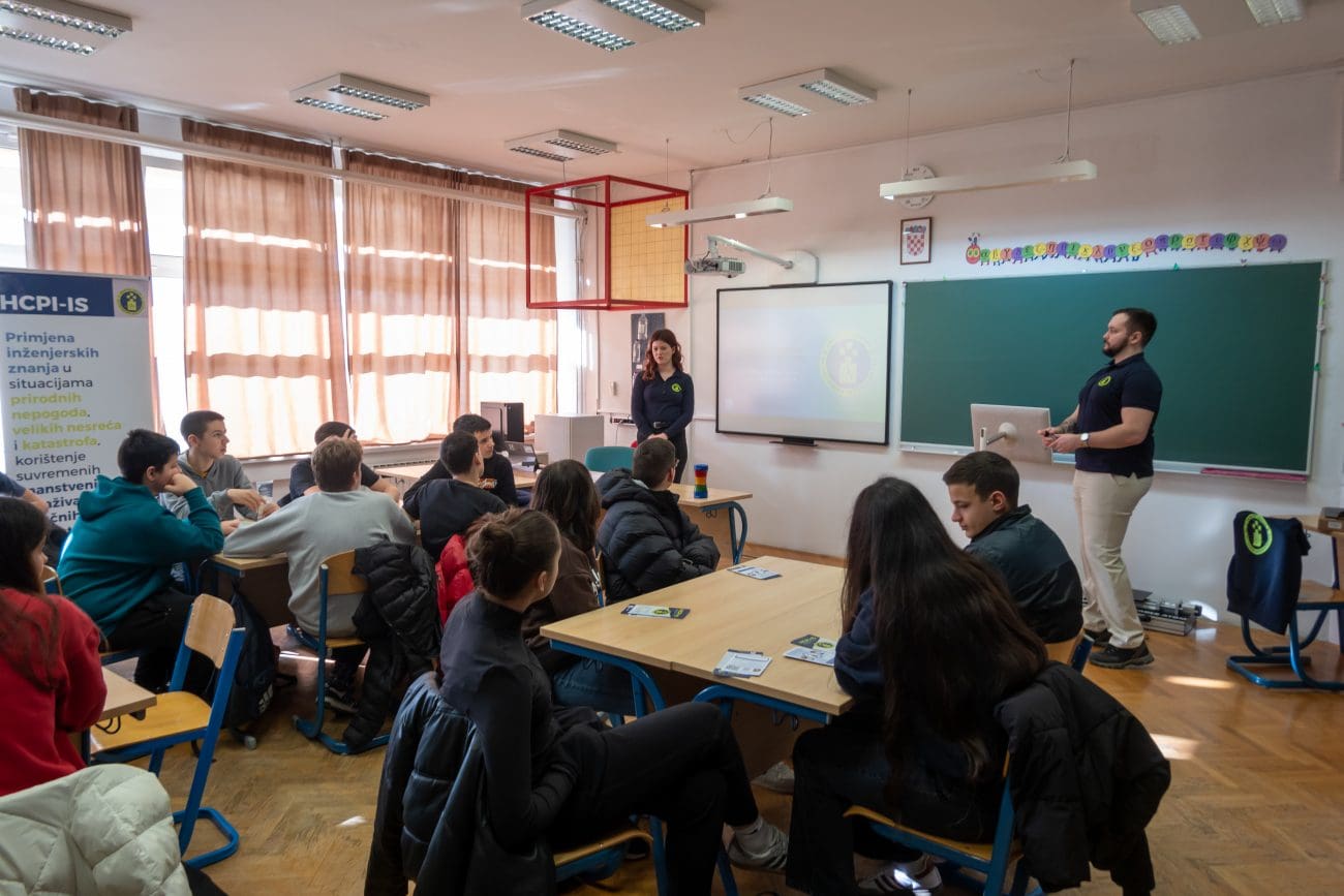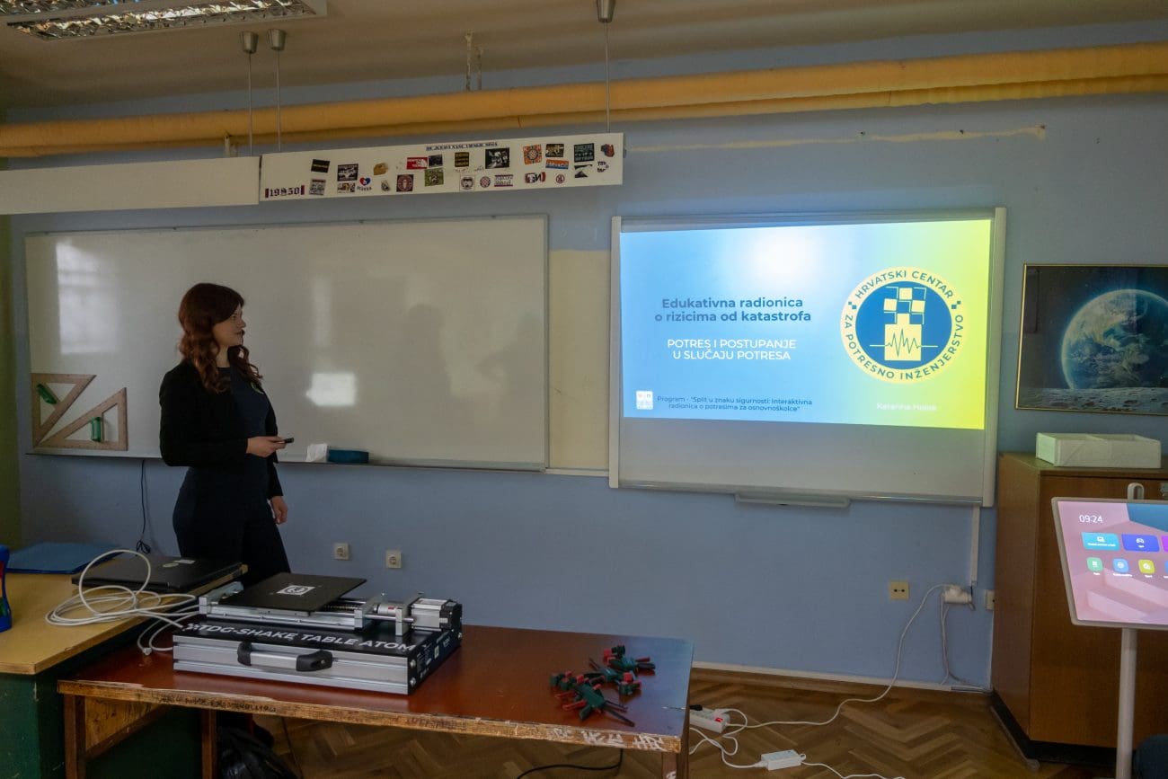 Hrvatski centar za potresno inženjerstvo – Interventna služba uspješno je proveo edukativne radionice posvećene podizanju svijesti o rizicima od potresa i pravilnom postupanju u slučaju katastrofe. Radionice su organizirane 28. i 29. siječnja 2026. godine u Osnovnoj školi „Manuš“, te 29. i 30. siječnja 2026. godine u Osnovnoj školi „Mertojak“, pri čemu su u obje škole sudjelovali učenici 7. i 8. razreda, što ukazuje na veliki interes za ovu temu.