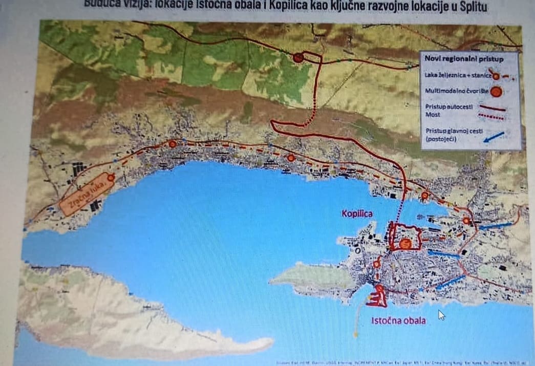 - Riječ je o amalgomaciji cijelog ovog područja, koje uključuje novi ulaz u Split s autoceste preko Vučevice. Strateški projekt je koji se raspetljava u Kopilici - naglasio je Zelić, dok je ilustracija bila budućeg prilaza Splitu kroz tunel Kozjak pa preko mosta između Kaštela i Stinica do trajektne luke!
