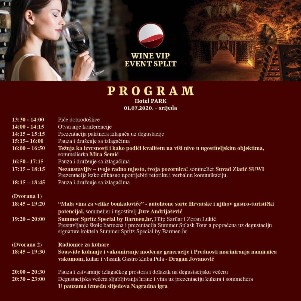 Program Wine Vip Eventa održava se od 14.00 do 20.00 sati, a nakon službenog djela programa sllijedi kruna događanja - tradicionalna degustacijska edukativna večera sljubljivanja hrane i vina a na kojoj mogu sudjelovati samo ograničeni broj gostiju a koji su sudjelovati i na edukacijama i radionicama.