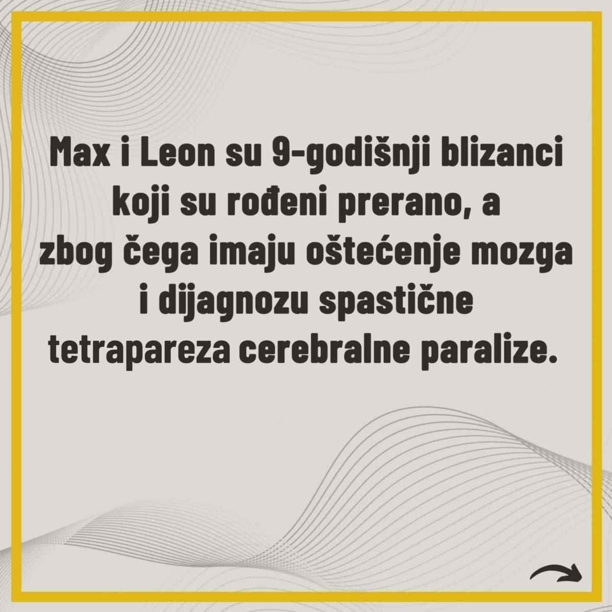 Max i Leon Marinov, dvojica su predivnih 'anđela', rođeni 2014. godine u splitskoj bolnici. Blizanci imaju cerebralno oštećenje koje im onemogućava normalni motorički razvoj. 100-i su invalidi; ne mogu samostalno sjediti, hodati niti se hraniti zbog čega im članovi njihove obitelji moraju biti maksimalno posvećeni.