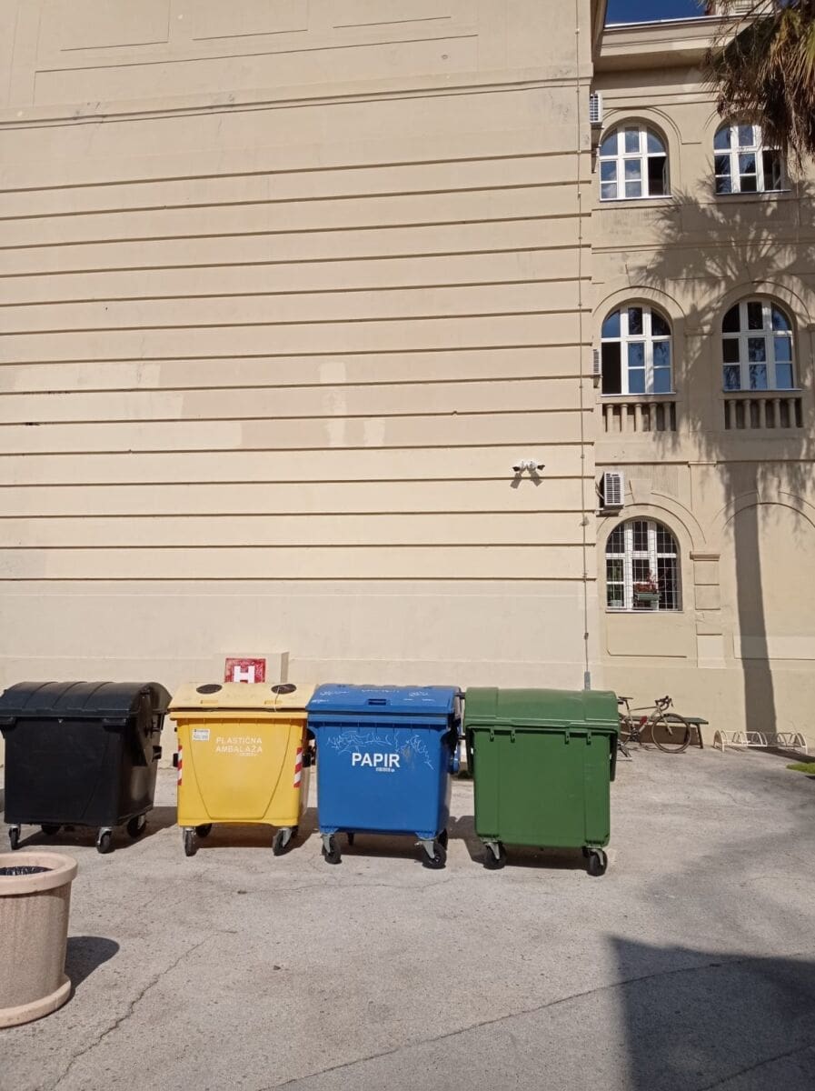 U nadi da ćemo sve spomenuti, potrebno je navesti sinergijski krug. Za već spomenute masline i održavanje istočne strane škole treba zahvaliti Parkovima i nasadima. Također, u suradnji s Čistoćom dobili smo smećnjake bez kojih naša inicijativa odvajanja otpada ne bi imala puno smisla. U istom smjeru, veliki obol dao je i Regionalni centar čistog okoliša, koji nam je donirao 18 kanti za odvajanje otpada, a nalaze se u hodnicima škole.