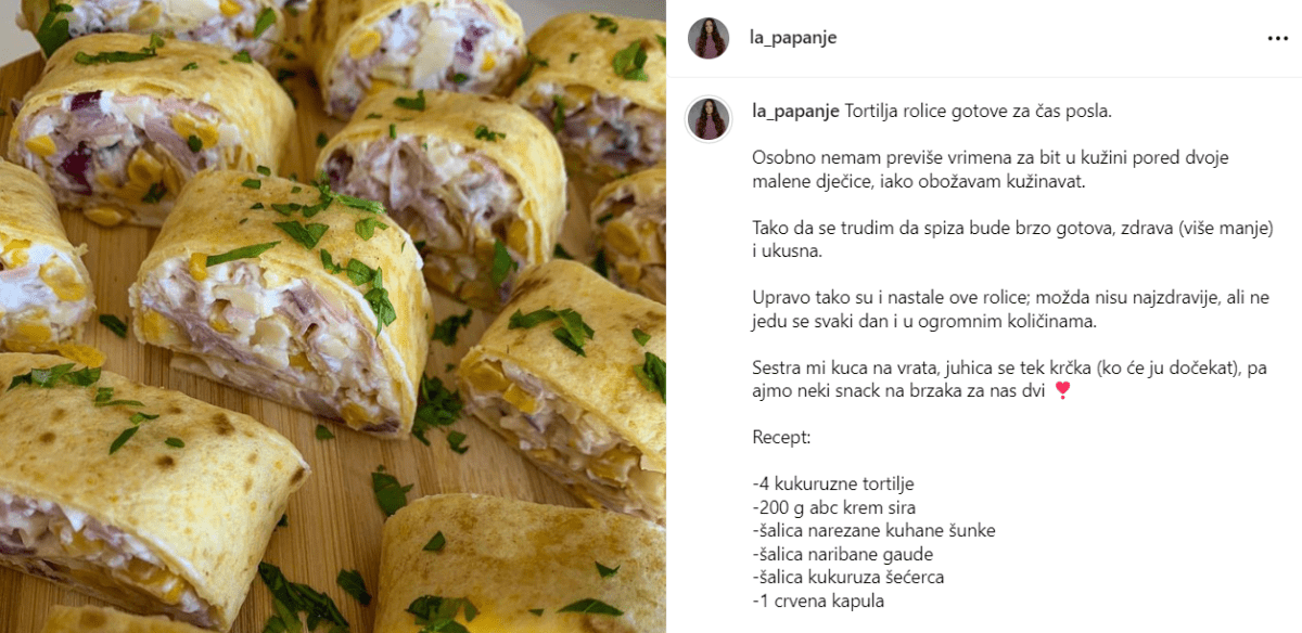 „Joj da, veliki sam fan tortilja. One su sve samo ne dosadne. Iako izgledaju na prvu kao okrugli komadić tijesta, s njima se mogu čuda raditi, praviti, oblikovati; hoćeš mekane, sirove, pečene, hrskave, slane, slane, tople, hladne, hoćeš kolač s njima, pizzu, kornetiće, palačinke, motane, trokutaste, ma bezbroj je varijanti. U stanu uvijek imam dva tri pakovanja tortilja i najdraže su mi kukuruzne, integralne i s chia sjemenkama. Veliko, ali veliko obožavanje. Na mome profilu ima pregršt recepata s tortiljama. Ako je netko od čitatelja također ljubitelj, slobodno nek baci oko i pronaći će nešto za svoj gušt“.