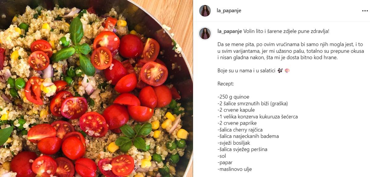 „ Žao mi je što ljudi misle da je zdrava hrana neukusna i da nemaju vremena za pripremu. Na mome profilu se može vidjeti kako određena jela budu gotova za 15 minuta, neka za pola sata ili 45 minuta. Sve je stvar dobre organizacije i biranja jednostavnih i zdravih namirnica, bez dugog kuhanja i boravka u kužini koji traje satima. Apsolutno ne. U životu sve pojednostaviti, pa tako i hranu. Kada se ušemiš, zavoljet ćeš to, vjeruj mi“, savjetuje mlada Ivana.