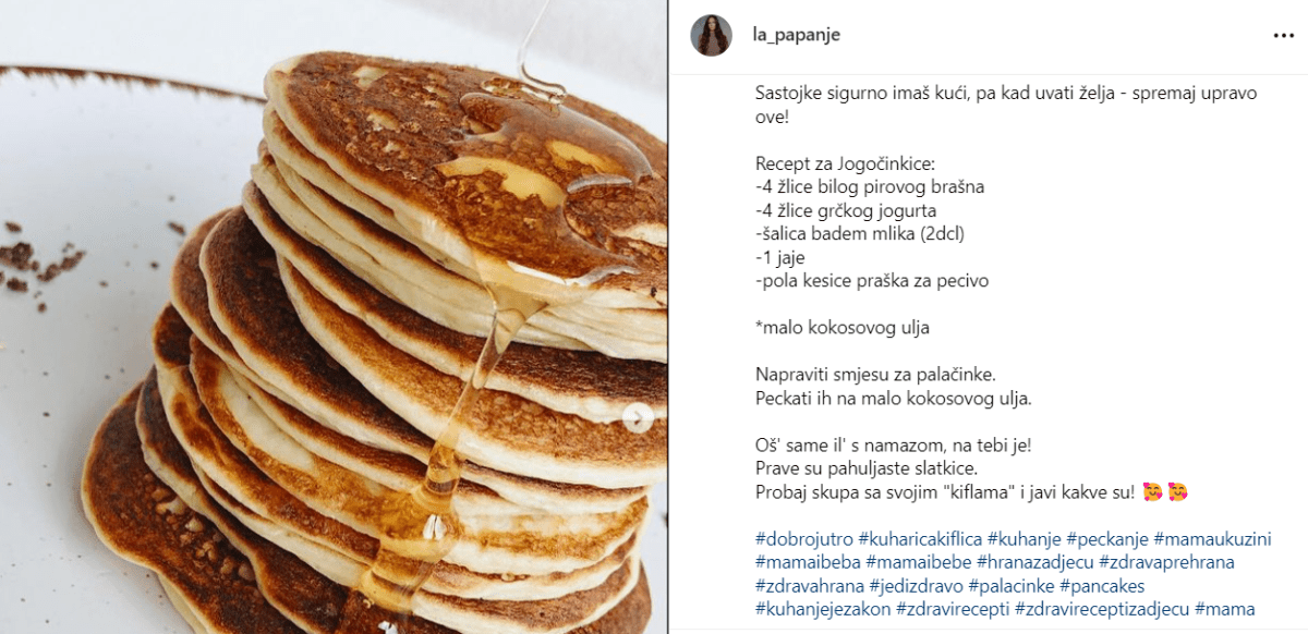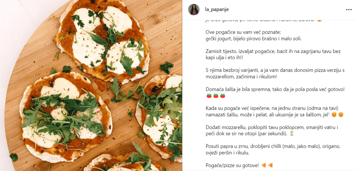 Kada ste već spomenuli pizzu i čokoladu, mi ćemo spomenuti i Big Mac, fritule, tortilje na bezbroj načina,…sve pripremljeno na zdravoj bazi, a recepte smo pronašli upravo na stranici 'lapapanje'. I svi vi koji koristite Instagram profil možete s lakoćom doći do ovih recepata, isprobati ih i možda razbiti predrasude (ako ste ih imali) prema zdravoj hrani. Osim što su sve namirnice jako zdrave i hranjive, neka od Ivaninih jela su i gotova za 'tili čas'. Naime za neka jela je potrebno samo 15 minuta. Izvrsno zar ne, imati gotov obrok za 15 minuta kada ti je dan ispunjen sa 100 i jednom obvezom i ne stigneš kuhati? Brz, ukusan i fin obrok!