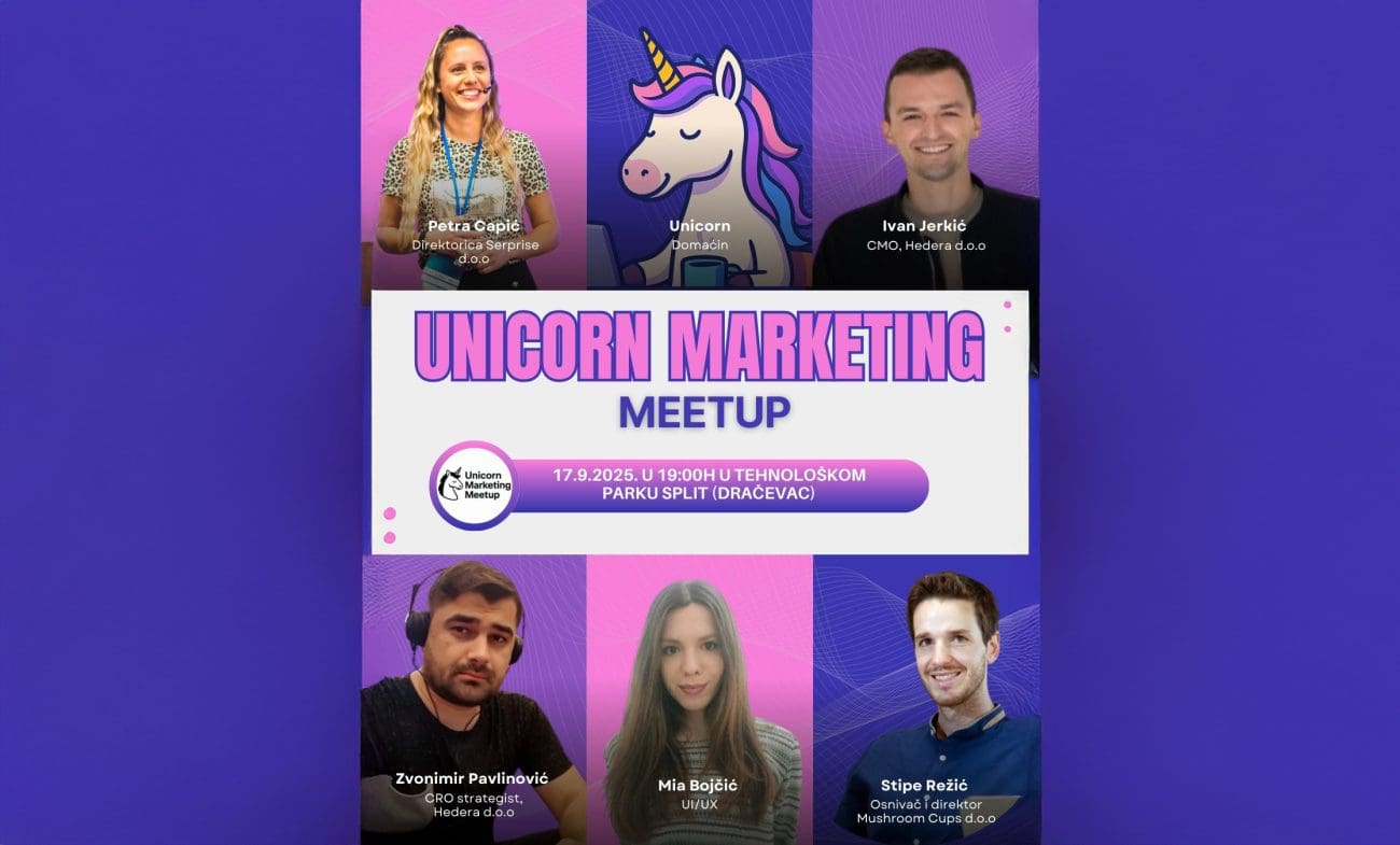 Unicorn Marketing Meetup je zajednica koja okuplja marketinške stručnjake, poduzetnike i kreativce s ciljem razmjene znanja, poticanja inovacija i stvaranja brandova koji ostavljaju trag. Organizatori meetupa su Hedera d.o.o., Mushroom Cups d.o.o., Zorina Mast d.o.o i SERP Rise d.o.o.