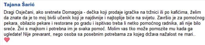 U svojoj posljednjoj objavi na Facebooku pozvali su građane ovog dijela Splita na prikupljanje plišanih igračaka i dugotrajne hrane za momka iz Osijeka. Naglasili su da se ne prikuplja novac već da Osječanin zarađuje prodajom plišanih igračaka.