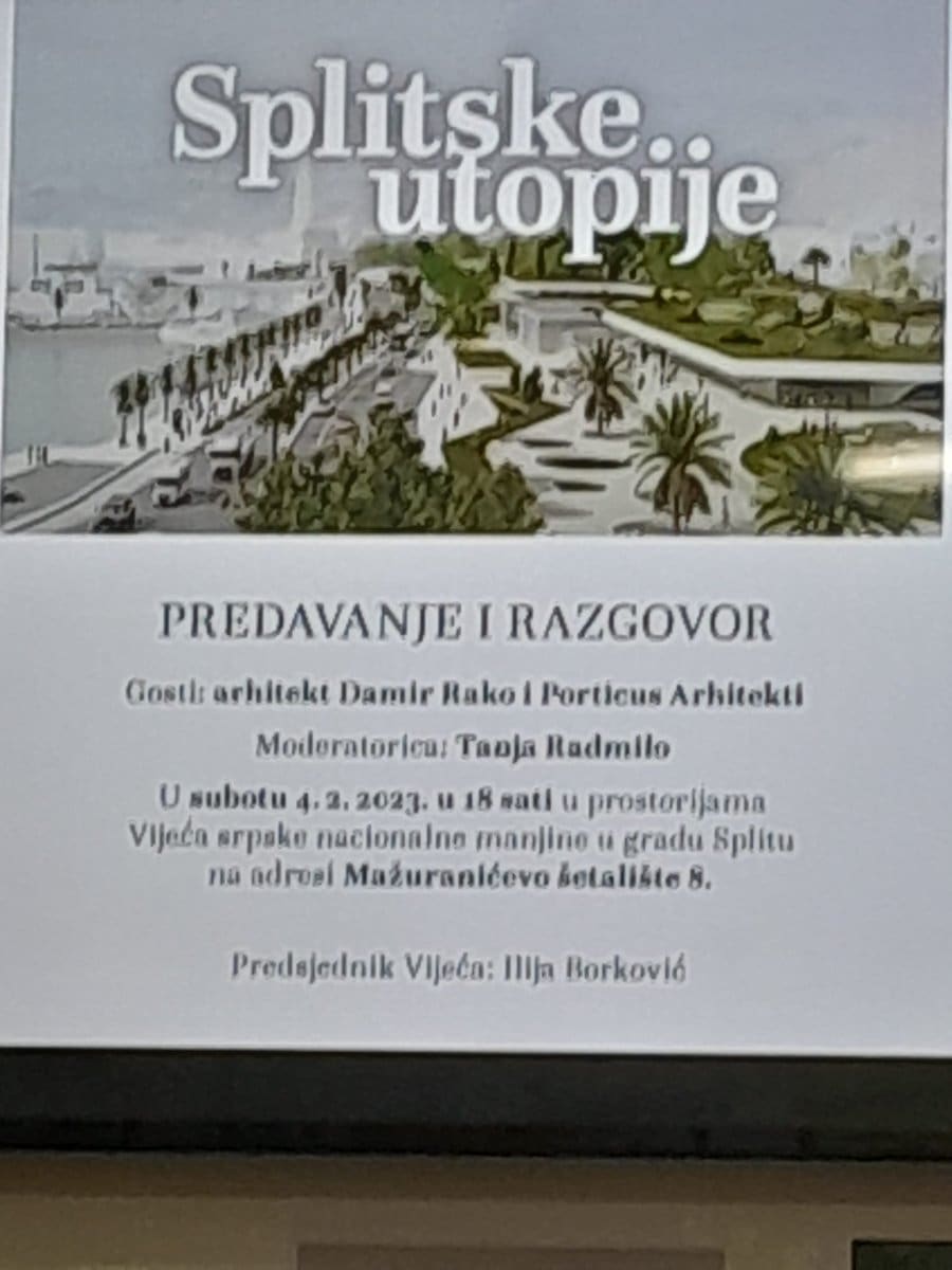 Gospodina Damira Raku šira javnost jedino povezuje s hotelom Briig na Bačvicama, ali naravno to je kap u moru njegovih radova. Poznajem njegov rad i veoma sam bila sretna kada sam ugledala obavijest da gos. Rako ima predavanje o arhitekturi našeg Splita, pod nazivom „Splitske utopije“.