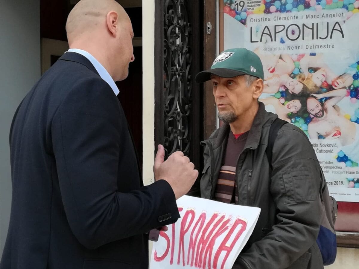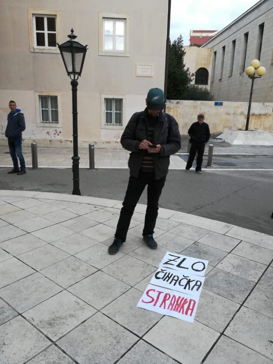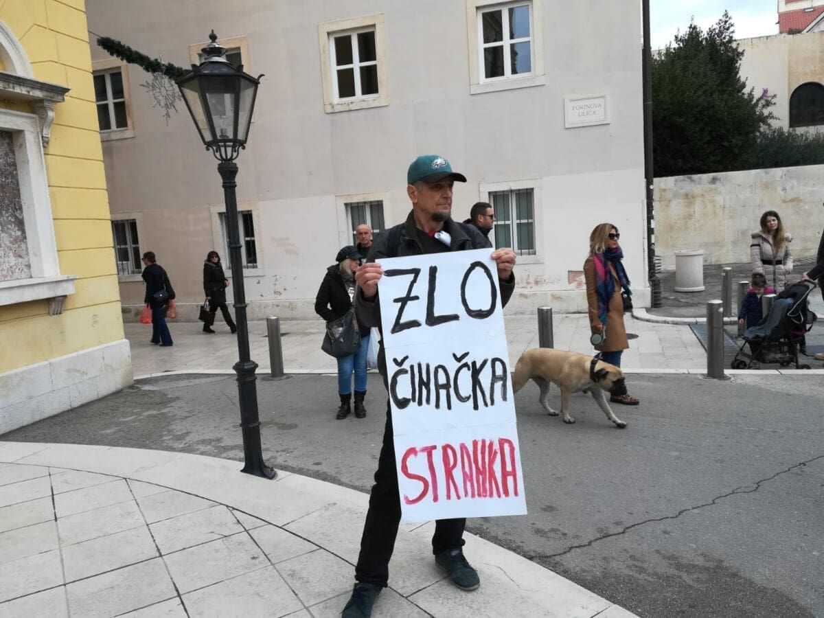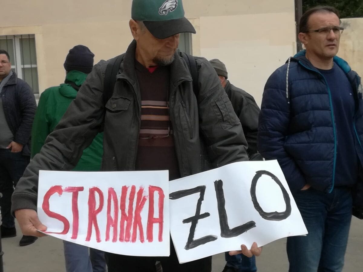 Prilikom izlaska, na Trgu ih je dočekao aktivist Zoran Burić, koji je je u rukama držao natpis 'zločinačka stranka'.