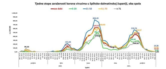 Kroz čitavo ljeto najveće tjedne stope zaraženosti imali su pripadnici skupine radno sposobnih građana 21-50 godina. Iza njih dolazi skupina mladih do 20 godina koji su čitavo ranije razdoblje bili s najmanjom stopom zraženosti uz dobnu skupinu starijih od 70 godina. Mladi se ni nisu mogli više zaraziti tj. prokužiti jer kod svake pojave infekcije u vrtiću ili razredu prestajali bi dolaziti na nastavu. Kažu da su više od dvije trećine školske godine 2020/2021 proveli kroz on line nastavu kod kuće.