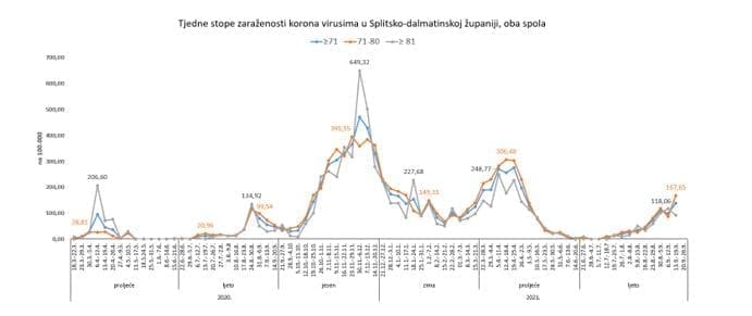 Raščlanjenjem dobne skupine starijih na dva dobna razreda 71-80 godina i više od 80 godina vidimo da se njihove krivulje tjednih stopa zaraženosti od sredine proljeća 2021. do sada prate. Stope zaraženosti su jednake u stalnom povećavanju proteklih dva mjeseca što znači da im je i obuhvat procijepljenosti jednako nedovoljan.