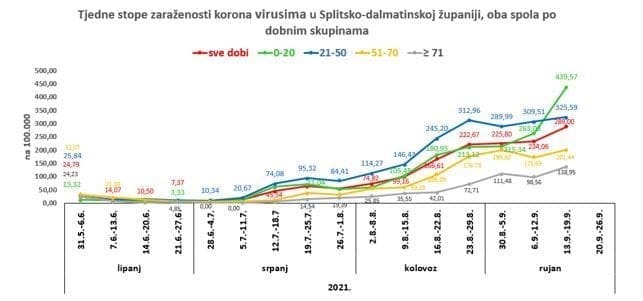 Sada, treći tjedan mjeseca rujna, dva tjedna od početka nastave mladi dobi do 20 godina tjednom stopom zaraženosti premašili su radno sposobnu skupinu 21-50 godina. Uzlet zaraženosti najmlađih je strelovit dok ostale dobne skupine imaju lagano povećanje stopa zaraženosti.
