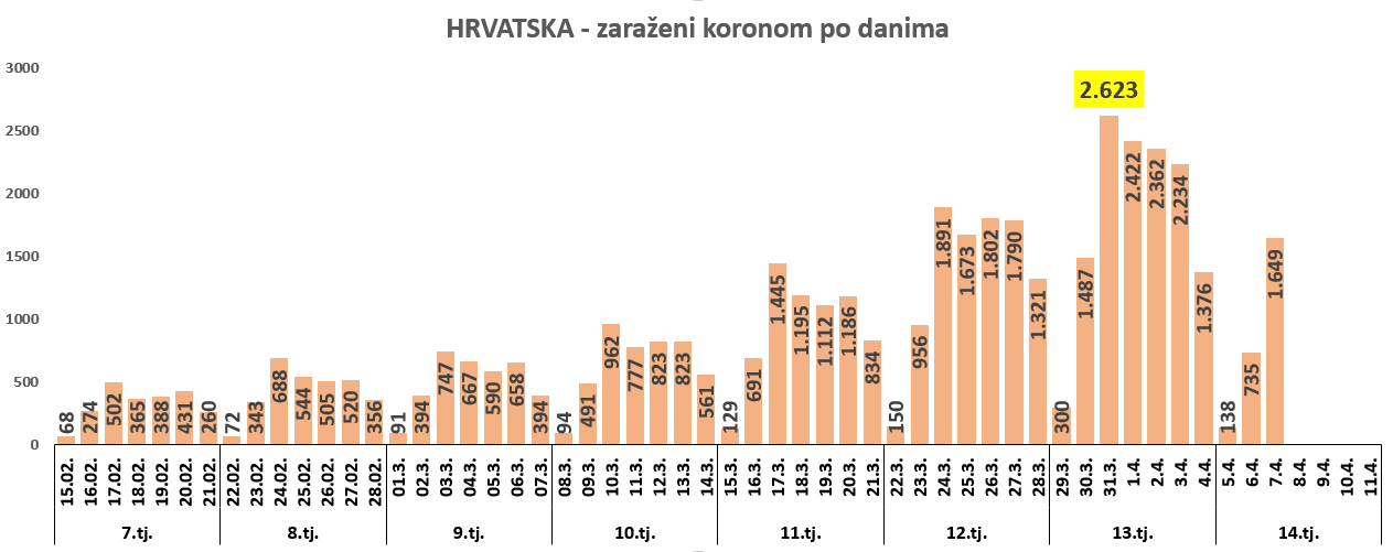Sedmodnevni prosjek na dan 7. travnja 2021. 1.559 zaraženih za 14,8 % je manji od najvišeg sedmodnevnog prosjeka 4. travnja - 1.829.
