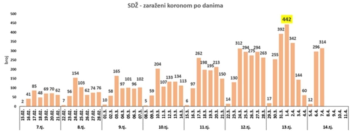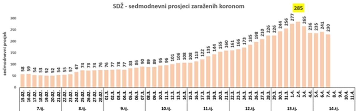 Nakon zabilježenog najvećeg broja zaraženih u ovom valu epidemije korone u SDŽ od 442 na dan prvog travnja slijede dani s manjim brojem zaraženih. Sedmodnevni prosjeci krajem trinaestog i početkom četrnaestog tjedna potvrdili su uočeni trend smanjivanja po danima.