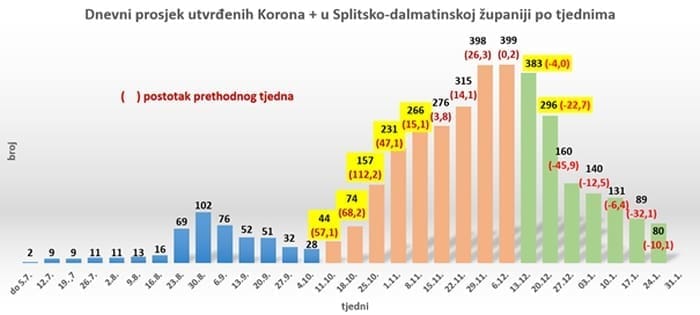 Nastavljam s dijagramom prikaza kretanja prosječnog dnevnog broja utvrđenih korona pozitivnih građana. U Splitsko-dalmatinskoj županiji (SDŽ) šest tjedana nakon 13. prosinca traje stalni pad broja zaraženih do broja od prosječno dnevno 80 zaraženih u posljednjem tjednu 24. siječnja što je na razini početka epidemijskog vala iz mjeseca listopada kada je uslijedio streloviti dvomjesečni uzlet zaražavanja do kraja mjeseca studenog, odnosno početka prosinca. Gotovo jednako koliko je trajalo povećavanje broja zaraženih toliko traje smanjivanje (simetrična raspodjela od po osam tjedana) (Slika1).