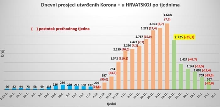 Jednako se zbivalo u cijeloj Hrvatskoj s jednom razlikom. Na samom stubičastom dijagramu uočljiv je znatno strmiji pad prosječnog dnevnog broja zaraženih koronom za više od 60% u dva tjedna. Dva razloga takvoj pojavi se mogu razmatrati: ili je tome uzrok neuvrštavanje rezultata brzih antigenskih testova u zvaničnu statistiku ili stvarno djelovanje epidemioloških mjera uvedenih i primijenjenih krajem mjeseca studenog. Moje je mišljenje da su tome doprinijele obje okolnosti uz činjenicu da je i prirodna potrošenost epidemijskog potencijala imala svoju neizostavnu ulogu (Slika 2).