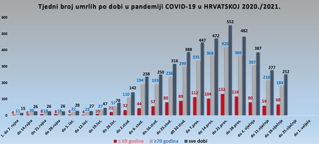 Do 18. siječnja od početka pandemije ukupno je u Hrvatskoj umrlo 4.655 bolesnika. Od tog broja 1.080 je mlađih od 70 godina, dob za koju se u Zapadnoj Europi smatra graničnom za prijevremeno nastupile smrti. Gotovo jedna četvrtina (23,20%) umrlih u Hrvatskoj pripada toj dobnoj skupini dok je iz iste dobne skupine prijevremenih smrti u Njemačkoj tek nešto više od jedne desetine građana (10,96%) (Slika 3.; Tablica 1).