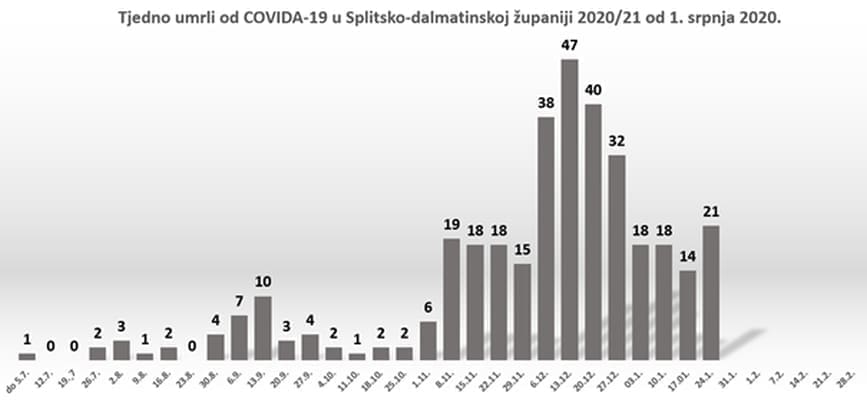 Broj umrlih od bolesti COVID-19 također je u smanjivanju kao posljedica smanjenog obolijevanja od COVIDa-19. Razumljivo, broj umrlih pojavljuje se u zaostatku od dva-tri tjedna od vremena zaražavanja.