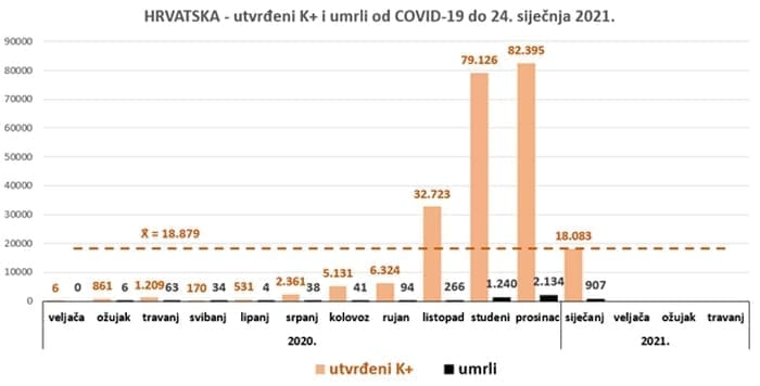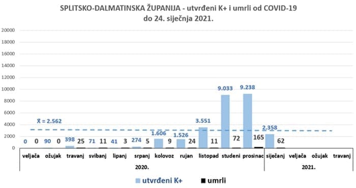 Broj zaraženih koronom i umrlih od COVID-a 19 po mjesecima u Hrvatskoj i SDŽ prikazani na dijagramima u Slikama 5. i 6. prikazuju da su samo mjeseci listopad, studeni i prosinac po broju zaraženih koronom iznad mjesečnih prosjeka. Za mjesec siječanj 2021. godine čiji broj zaraženih se odnosi na razdoblje do 24. siječnja očekuje se da će prijeći prosječni mjesečni broj zaraženih. Tako su epidemijska četiri mjeseca što bi po trajanju odgovaralo nešto manje od trajanja prosjeka sezonskih epidemija gripe. Po vremenu ispoljavanja epidemije istovjetnu krivulju imali smo samo kod epidemije gripe A H1N1 pdm09 tzv. svinjska gripa iz sezone 2009/10 koja je u Hrvatskoj završila samim početkom mjeseca siječnja.